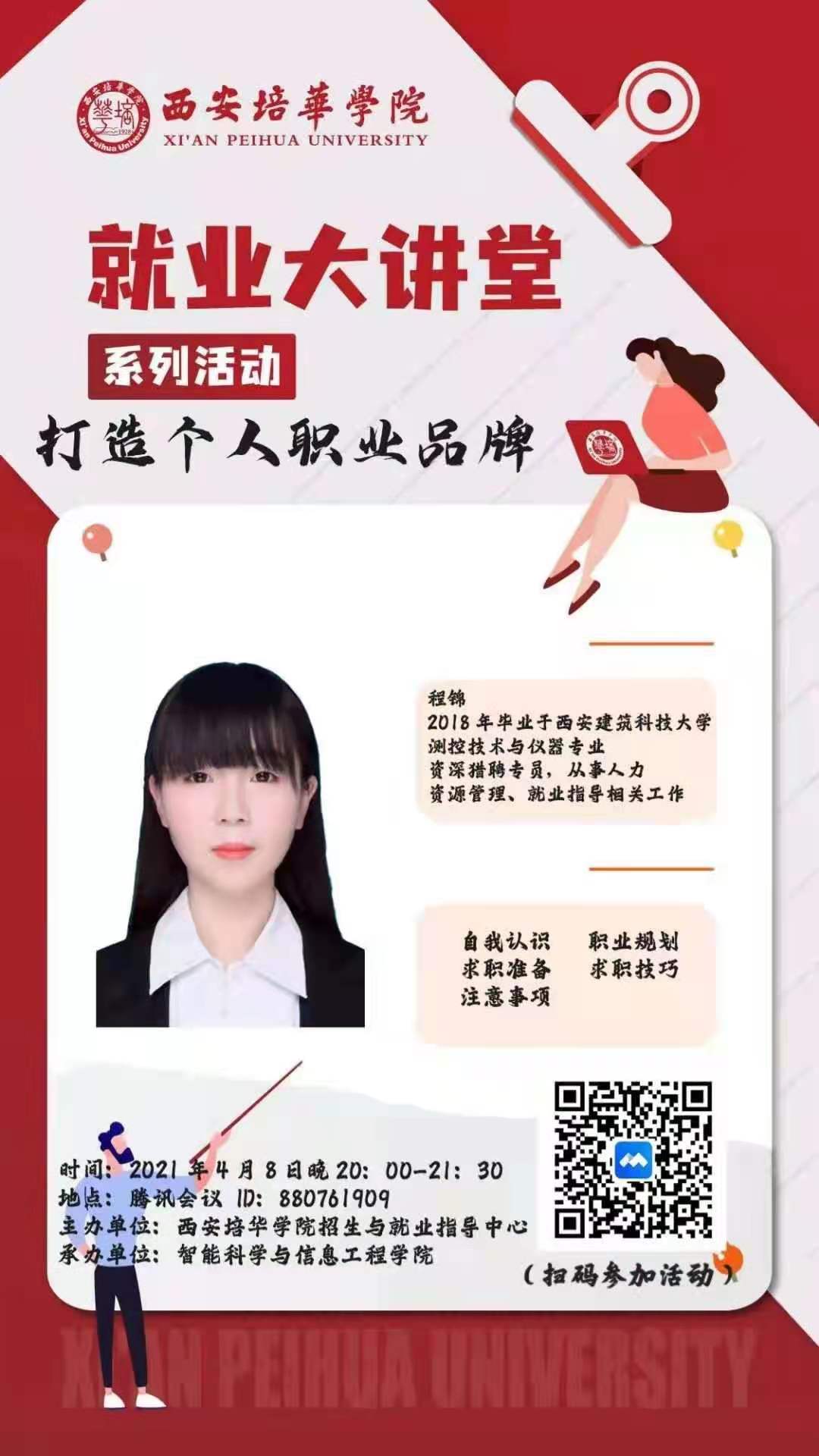 为进一步推动2022届毕业生就业指导工作,帮助毕业生了解就业形势,提高就业素质,我院特邀请陕西公众智能科技有限公司程锦老师于2021年4月8日20:00,为我院2022届毕业生作就业指导工作,此次讲座由我院就业专干杨桂锋老师主持。