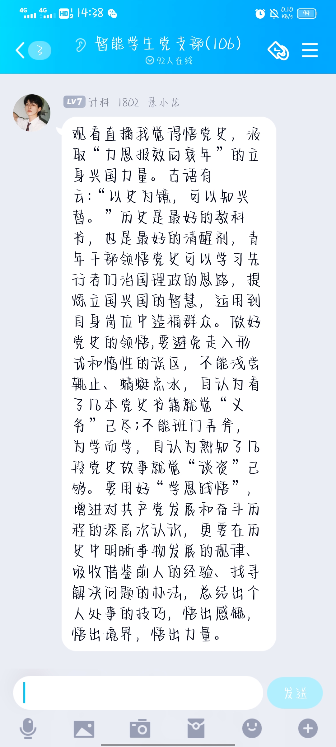 今年是中国共产党成立一百周年,为认真学习贯彻习近平总书记在党史学习教育动员大会上的重要讲话精神,深入推进党史学习教育,引导广大师生从党的百年非凡历程中感悟思想伟力、汲取奋进力量。省委教育工委委托陕西大学生形势政策教育信息中心邀请教育部高等学校社会科学发展研究中心主任、北京师范大学教授、博士生导师王炳林,于2021年4月1日(星期四)10.00-12:00为我省高校师生作《从党的历史中汲取智慧和力量》主题报告。智能科学与信息工程学院党总支组织师生党员通过线上观看报告会直播,并纷纷发表心得感悟。