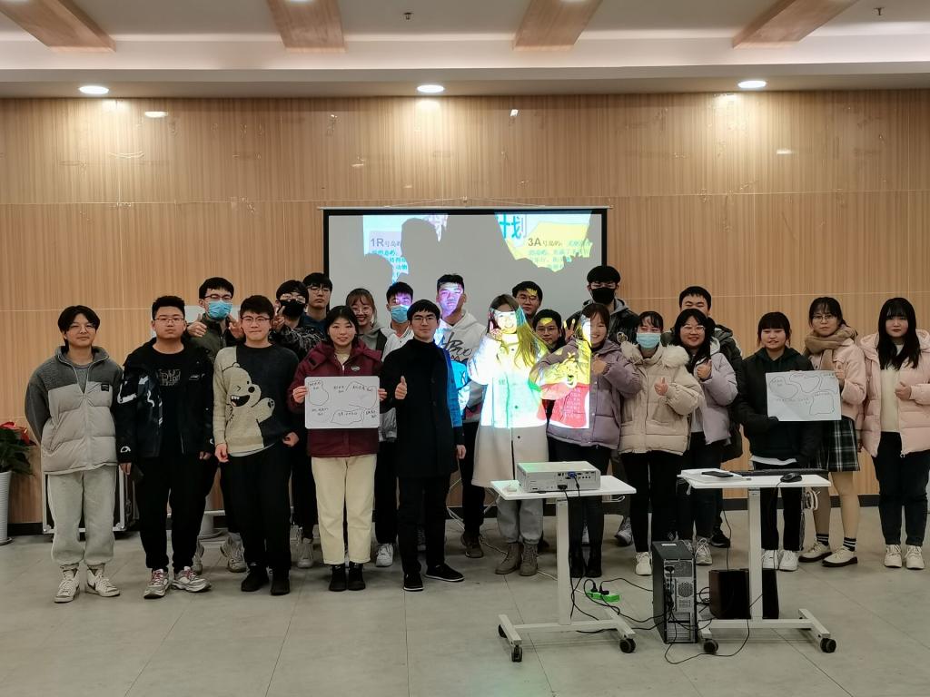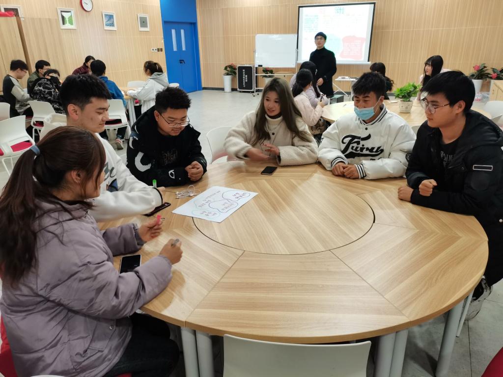 同学们五人一组,分为四组,每个人说出自己的姓名以及自己的三个兴趣爱好或者优点。然后由一名同学开始,说出自己左边的学生的姓名以及情趣爱好或优点,以此类雅,五人说完为止。此项活动使大家在会议正式开始之前先互相了解,熟悉彼此,为活动的进行以及大家更好地交流做好了铺垫。在一阵阵欢乐的笑声中整个氛围也变得放松愉悦起来,使会议逐渐进入状态。