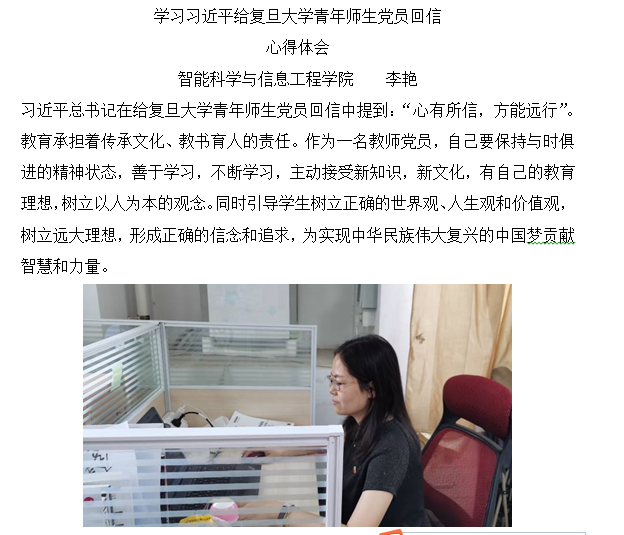 教工支部书记毛莉君老师说,教工支部全体党员同志认真深入的学习了习近平总书记的回信。此回信恰是给复旦大学《共产党宣言》展示馆“星火”党员志愿服务队的回信,作为智能学院教工党员志愿服务队一员,我们要以复旦大学《共产党宣言》展示馆“星火”党员志愿服务队为榜样,坚守高校教育阵地,坚持立德树人的根本任务,深刻领会习近平总书记来陕考察重要讲话精神,从延安精神中汲取力量,将延安精神融入到高校思政课程教研教改。坚持用延安精神滋养初心,淬炼灵魂,铸魂育人,充分发挥教工党员志愿服务队的专业特长,遵循“服务校园、奉献社会”的原则,以身作则,践行使命,弘扬“奉献、友爱、互助、进步”的志愿者精神。