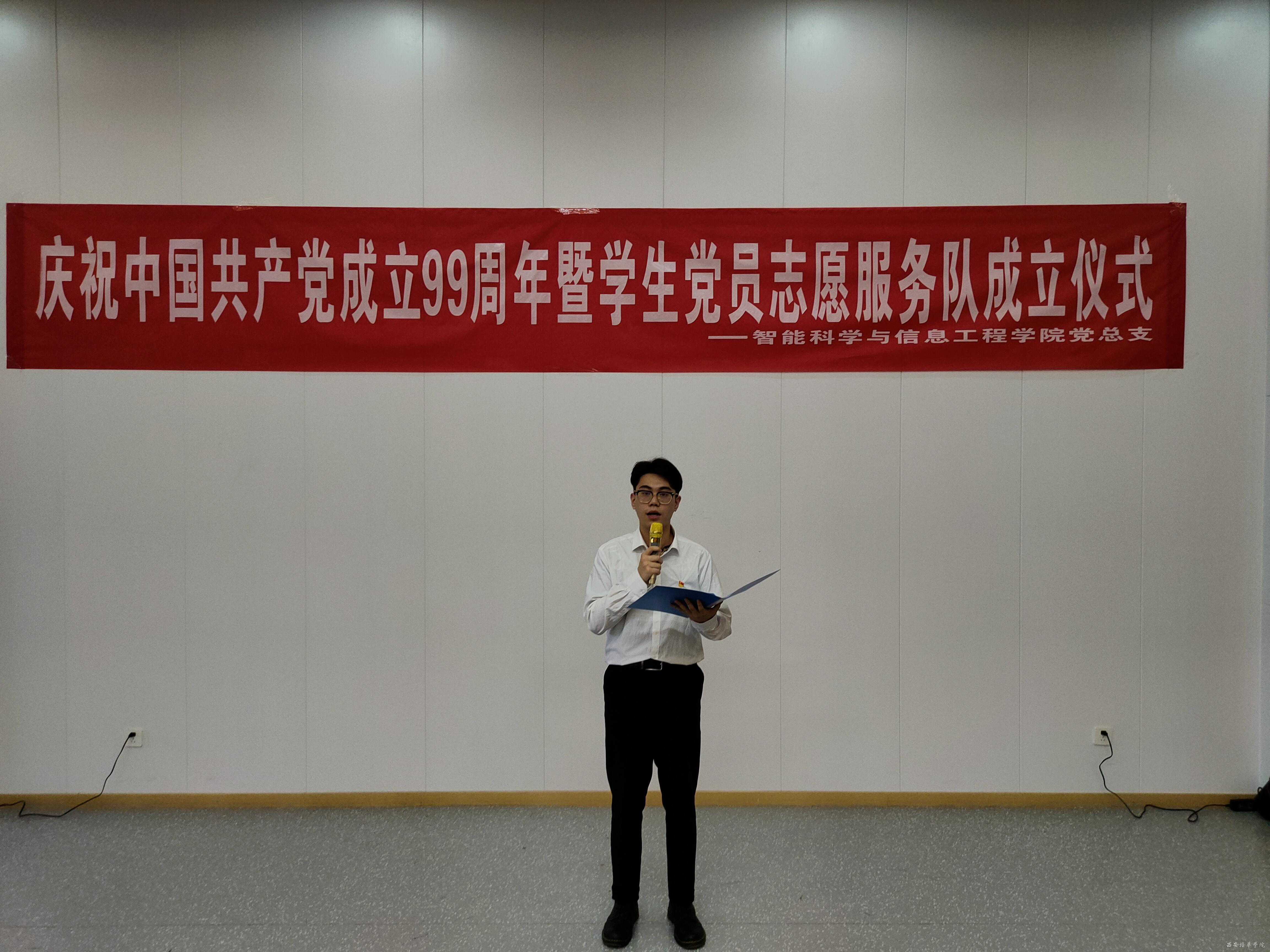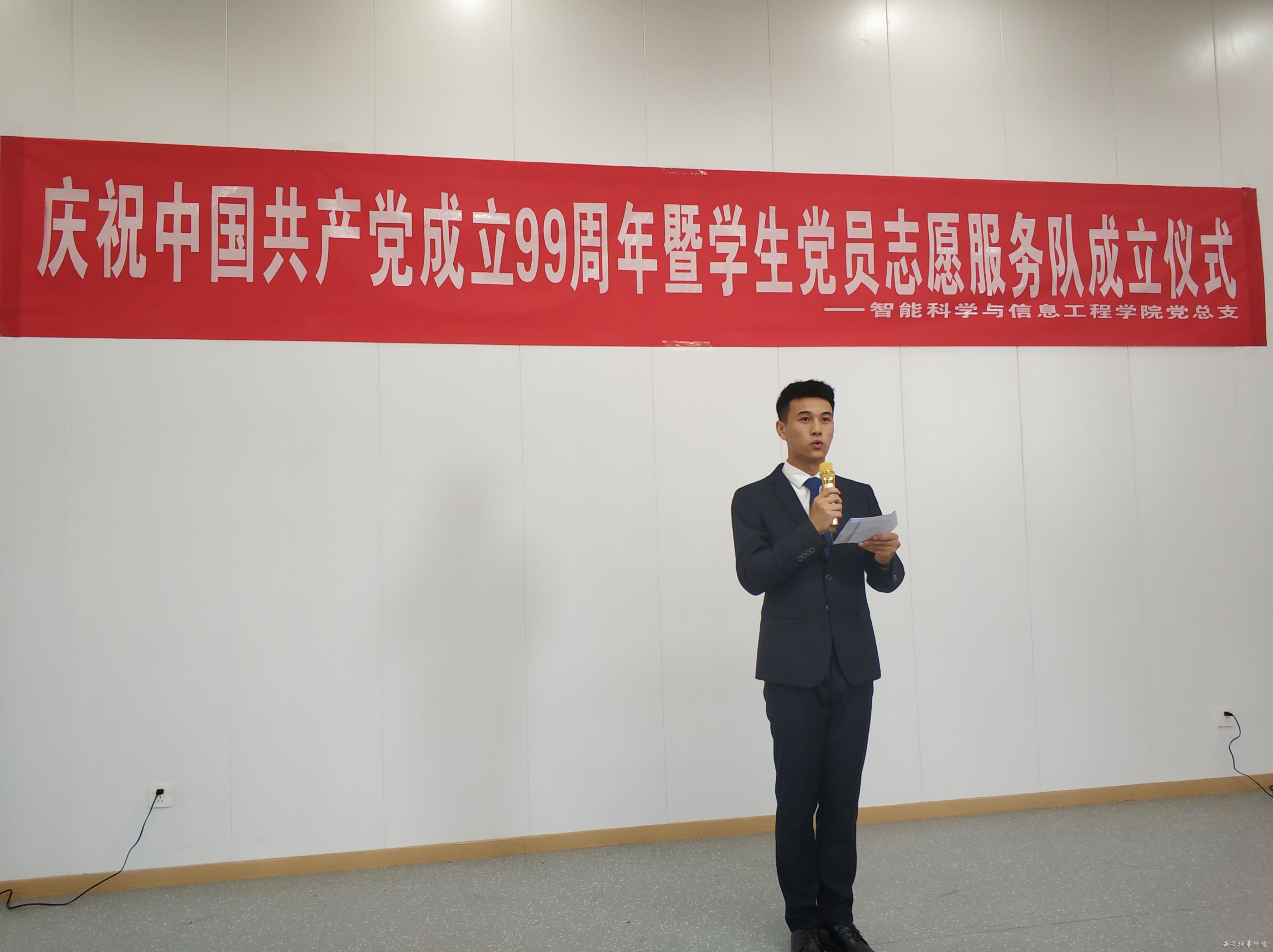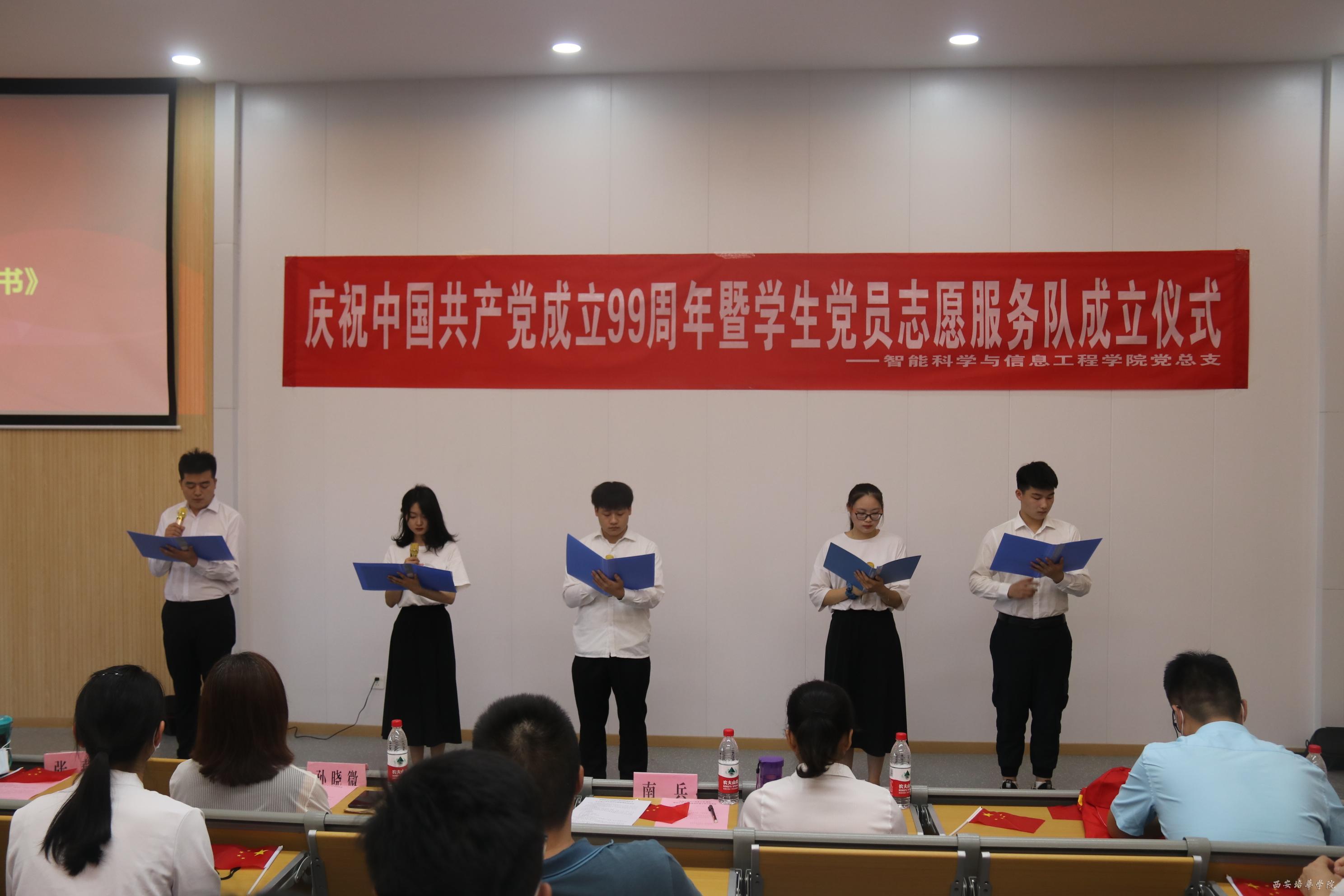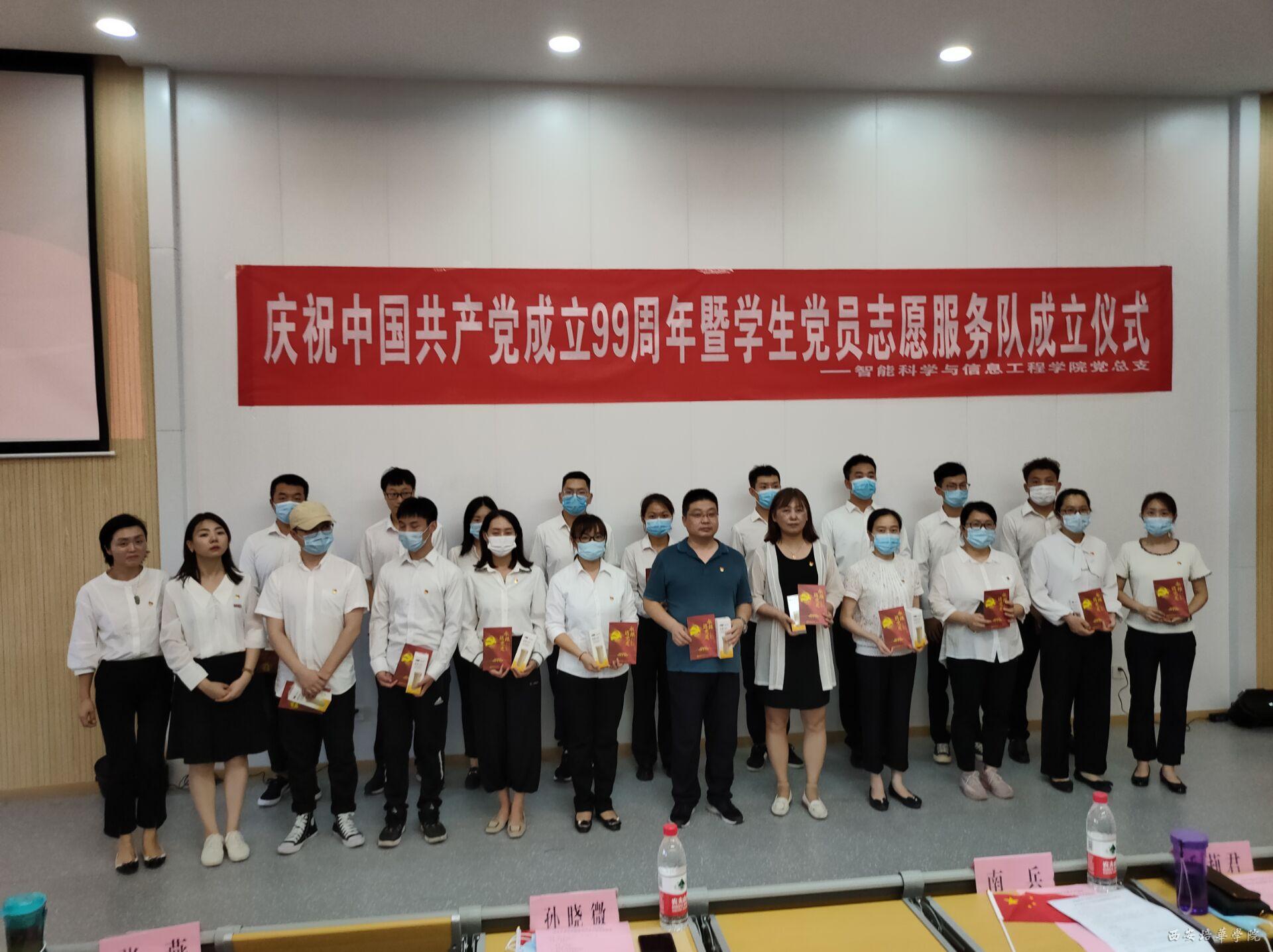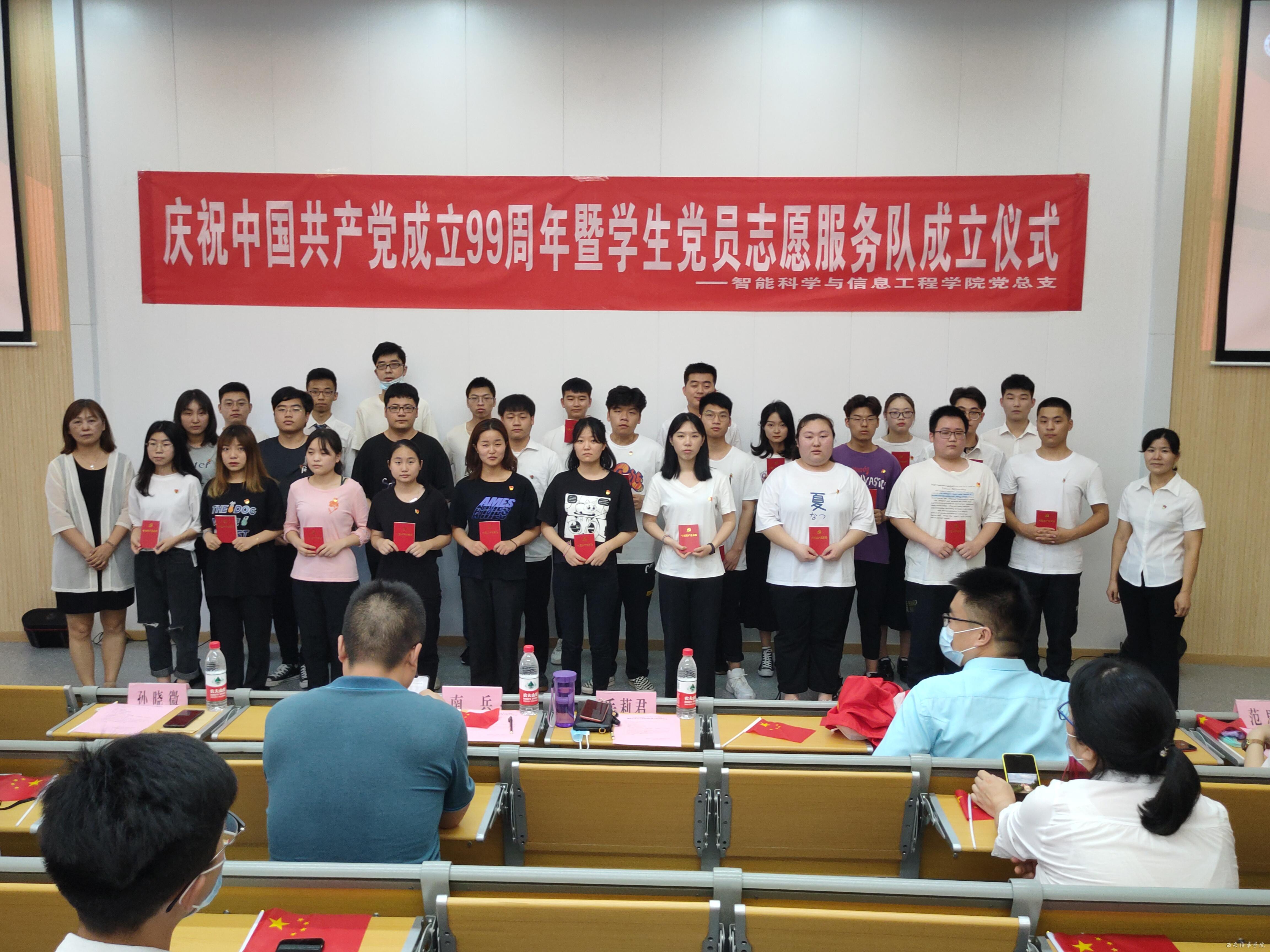 在党的生日到来之际,智能科学与信息工程学院党总支于2020年6月30日在3505教室隆重召开“不忘初心,牢记使命”庆祝中国共产党成立99周年主题党日活动暨学生党员志愿服务队成立仪式。参加本次活动的有智能科学与信息工程学院教工支部书记毛莉君、党务兼行政干事孙晓微、学生支部书记王伟平、党总支委员张燕、团委书记范思媛及各位党员、积极分子代表。