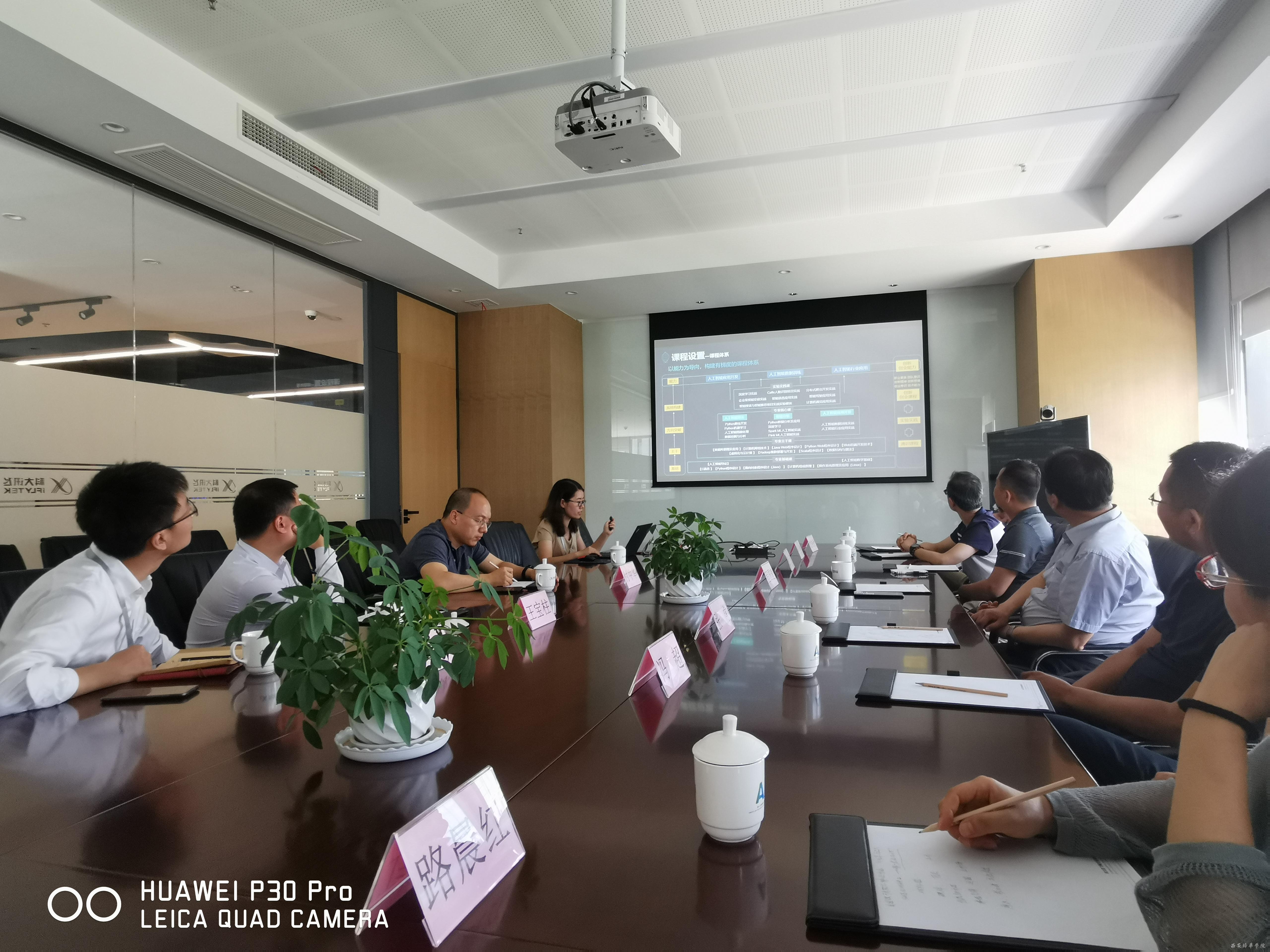 随后,程院长一行与科大讯飞西安研究院付中华院长进行了深入的交流座谈,付院长详细介绍了科大讯飞与西安高校AI联合实验室的情况,同时就AI+教育从专业课程体系建设、人才培养等方面进行了详细介绍。程院长对讯飞AI专业课程体系建设及技术平台均表示认可与赞同,同时也介绍了我院专业建设情况及人工智能方向下一步建设计划。程院长表示,期望从产学研协同育人、人工智能基础课程建设、数据资源、实习实训、横向项目等各个方向建立双方合作关系,助力提升师资队伍建设,培养高素质应用型本科AI人才。