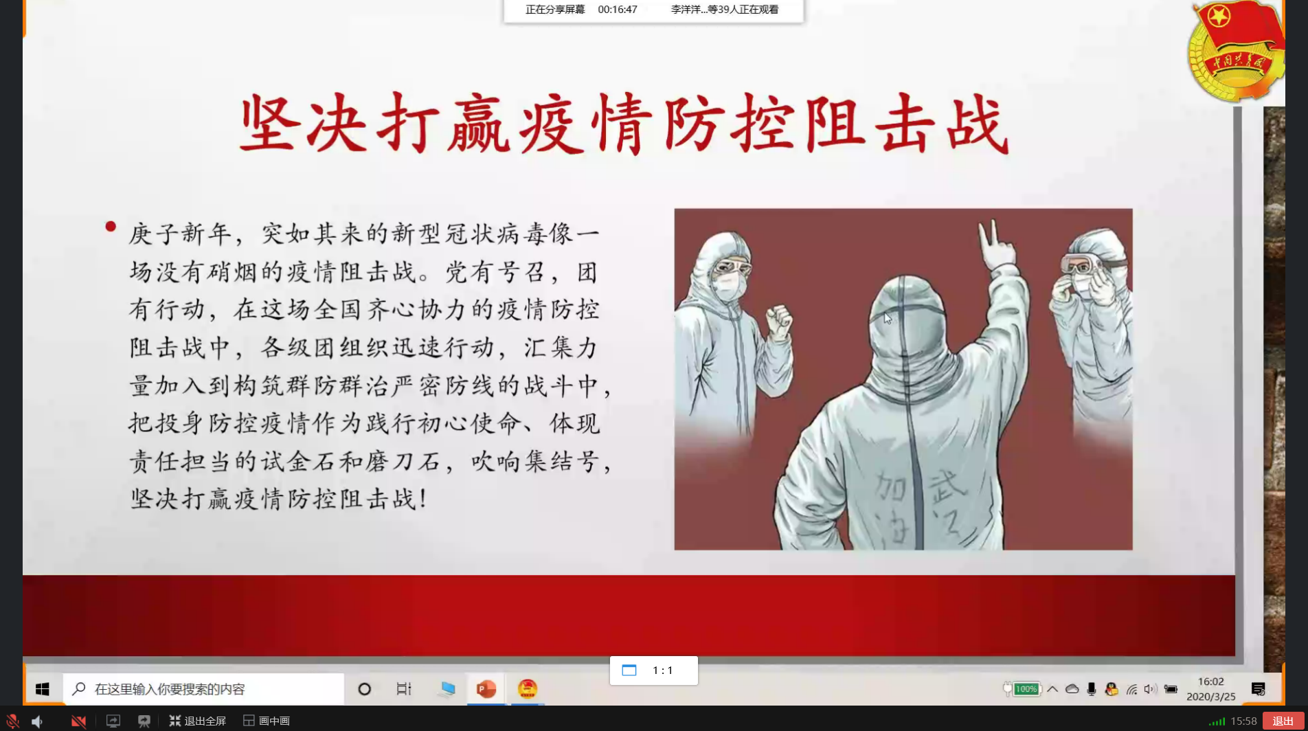 举国之力,万众一心,对抗疫情,我们要与全国人民携起手来,一起打赢这场疫情阻击战。为宣传“志愿抗疫,雷锋精神”,智能科学与信息工程学院于2020年3月25日至4月9日开展了“颂雷锋精神”的线上主题团课活动,我院全体大一团支部参加此次活动。