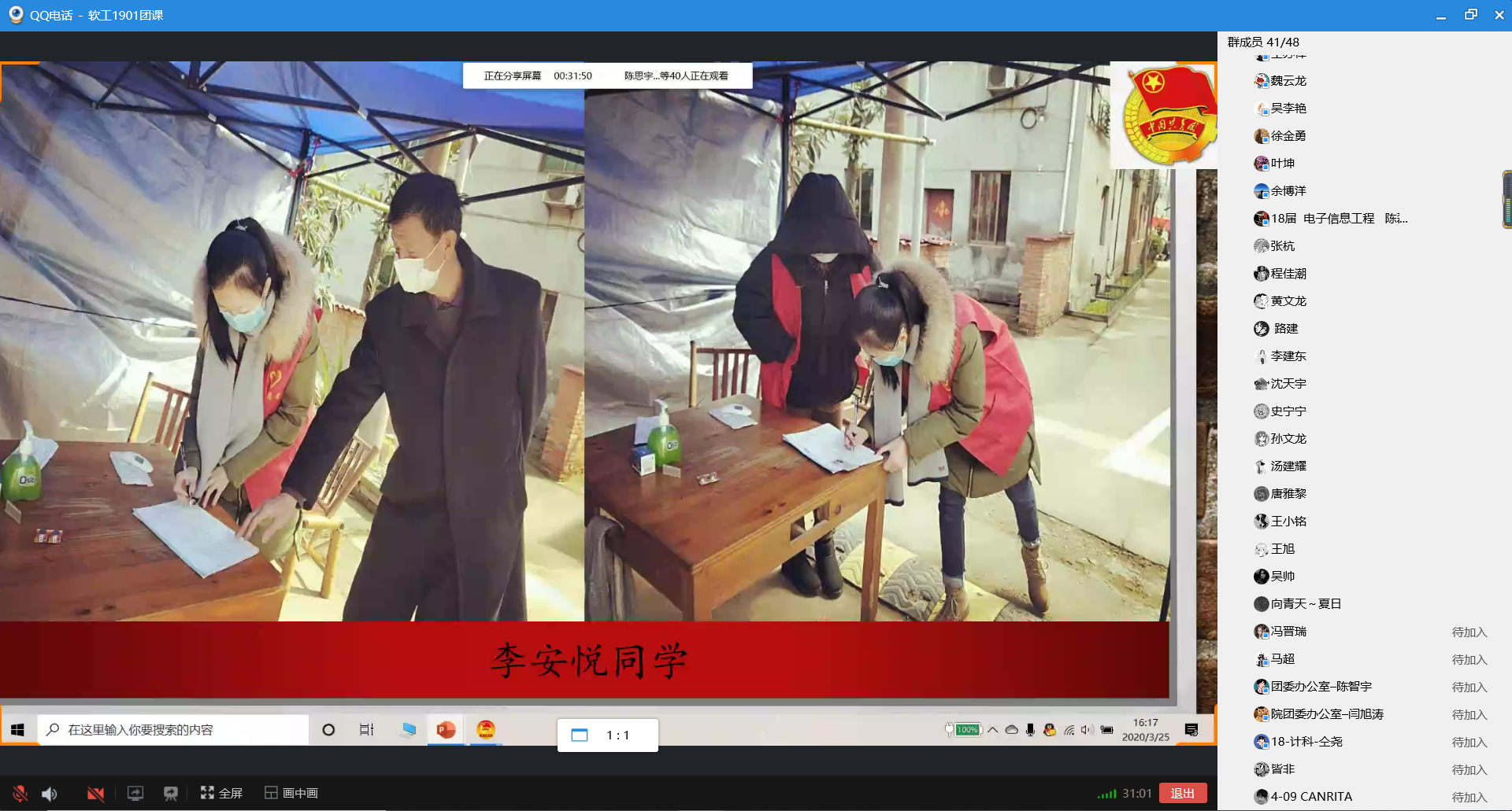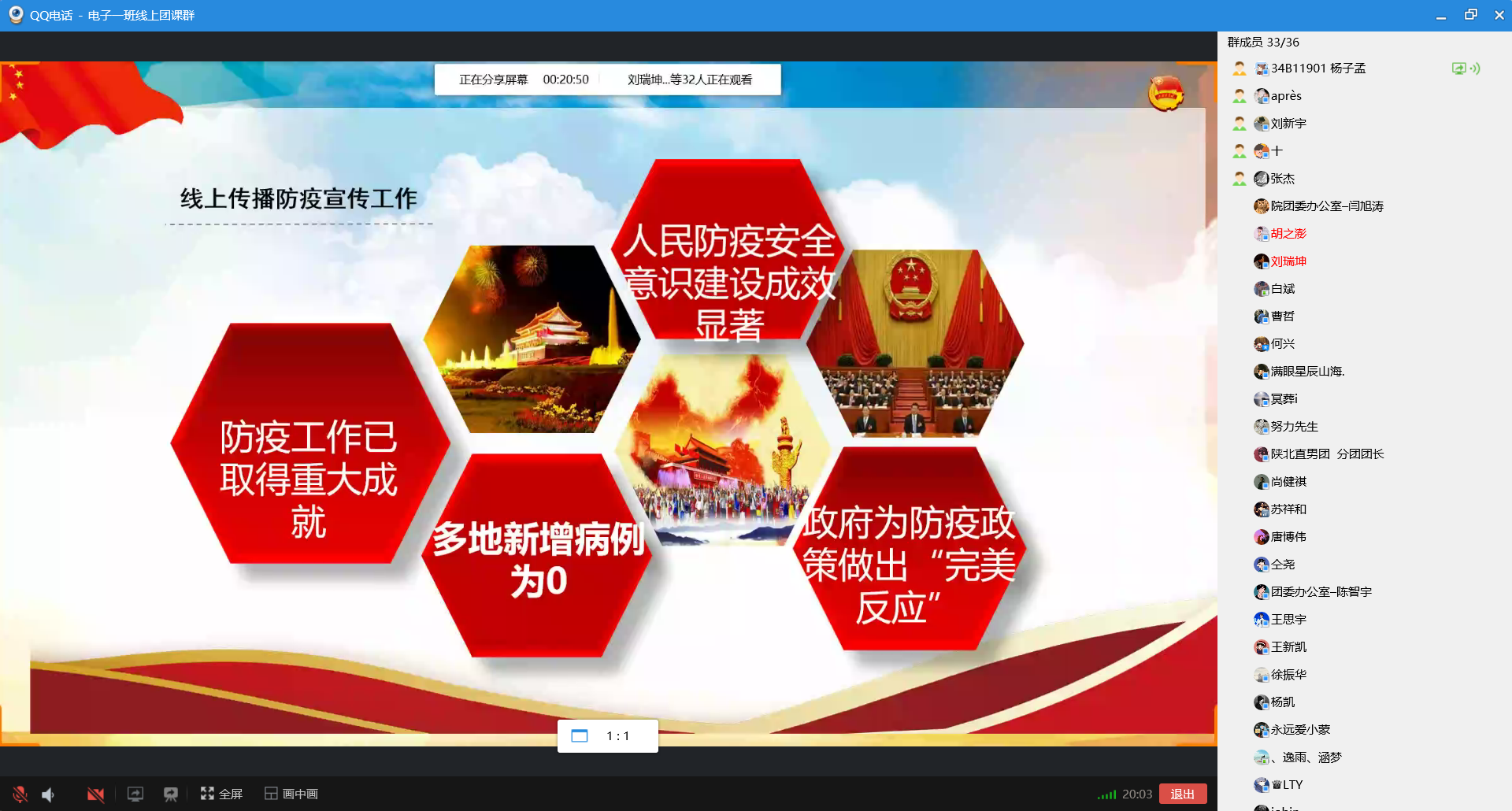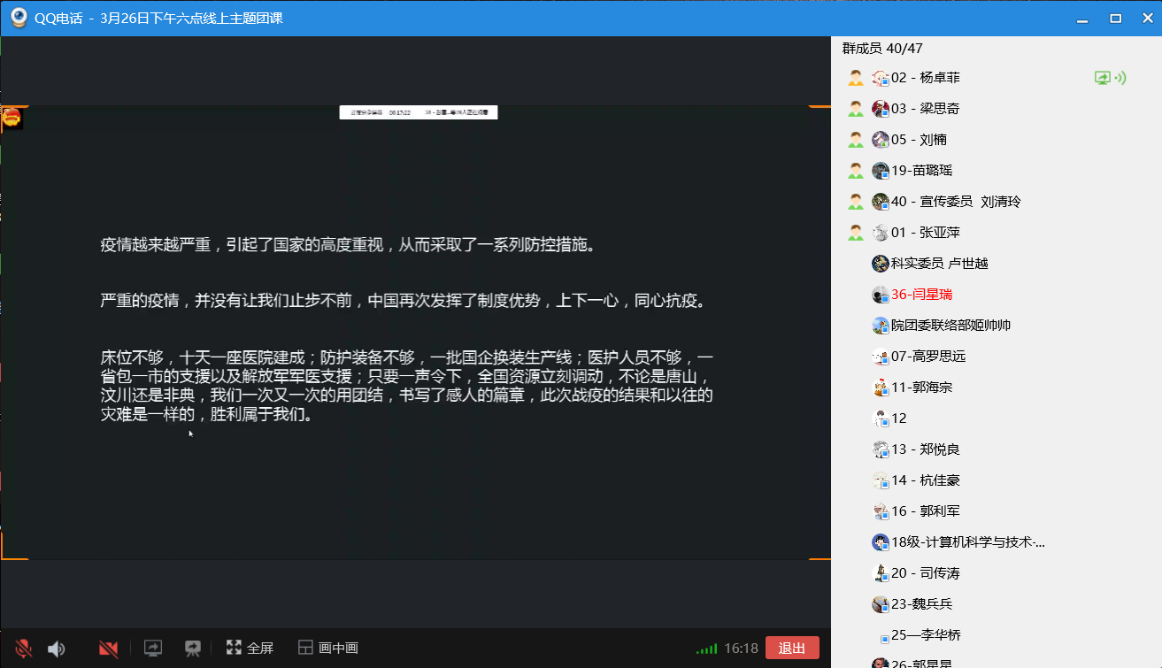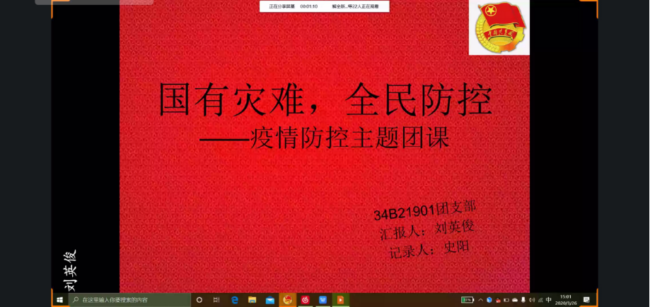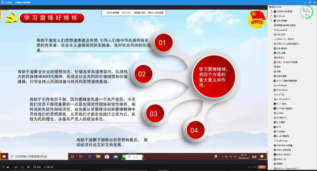 九个团支部分别通过ppt演讲、视频演示等多种形式,介绍了雷锋生平、雷锋事迹、雷锋语录等,全面地诠释了雷锋精神的内涵和意义。同时通过图文、短视频等多种形式向大家传授疫情期间自防、他防等技巧,体现出我国政府部门、各级党组织高度重视疫情的各项防控工作以及为抗击疫情所做出的努力,不仅有利于弘扬雷锋精神,加强团员的思想、道德建设,而且让大家受益匪浅。