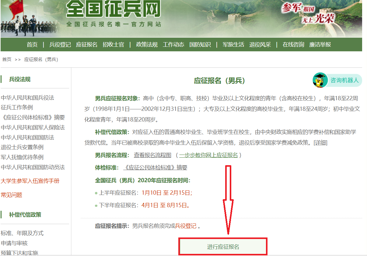 1、登录全国征兵网,点击应征报名。