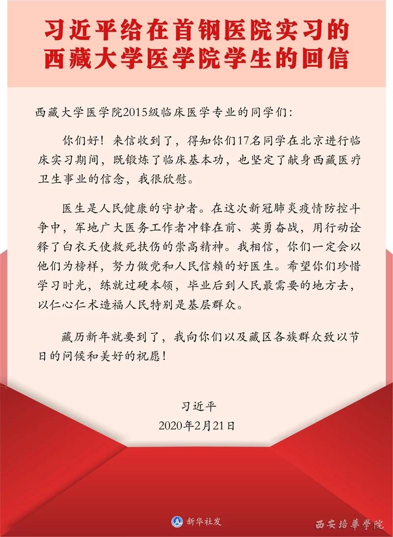 2月21日,在藏历新年来临之际,习近平总书记给在正在北京大学首钢医院实习的西藏大学医学院学生回信,表示对他们坚定献身西藏医疗卫生事业的信念感到欣慰。回信中提到在这次新冠肺炎疫情防控斗争中,军地广大医务工作者冲锋在前、英勇奋战,用实际行动诠释白衣天使救死扶伤的崇高精神。习近平总书记对他们提出希望他们珍惜学习时光,练就过硬本领,毕业后到人民需要的地方去,以仁心仁术造福人民特别是基层群众的勉励与期望。