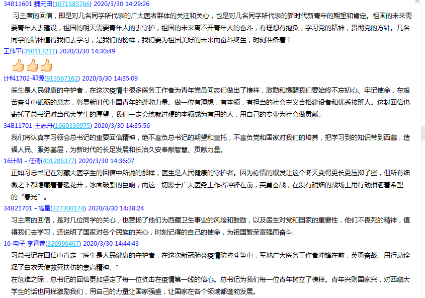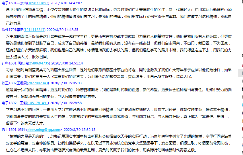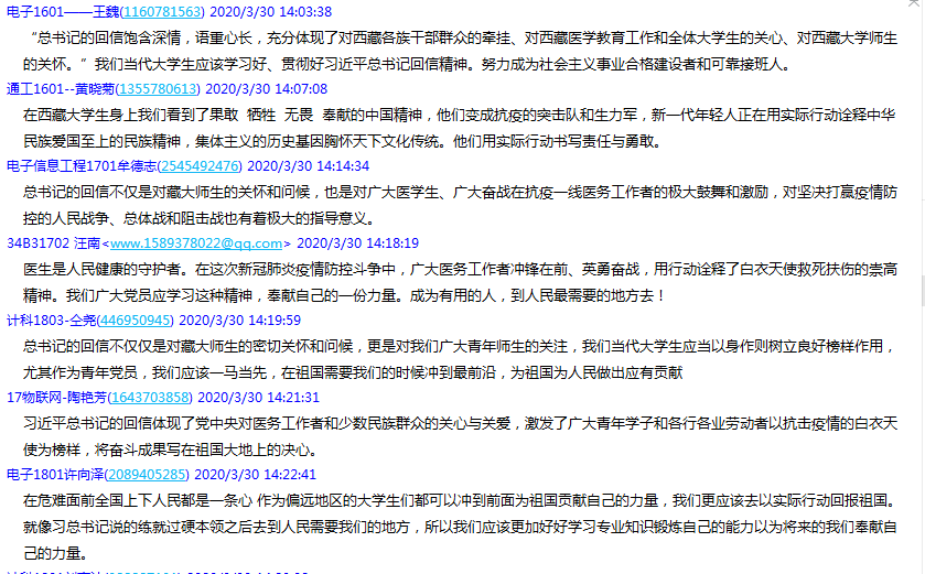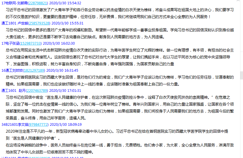 计算机科学与技术1601冯恒鑫:习近平总书记在回信中肯定“医生是人民健康的守护者,在这次新冠肺炎疫情防控斗争中,军地广大医务工作者冲锋在前,英勇奋战。用行动诠释了白衣天使救死扶伤的崇高精神。”在危难之际,总书记的回信更加坚定了每一位抗击在疫情第一线的信心。总书记为我们每一位青年树立了榜样。青年兴则国家兴,对西藏大学生的话也同样激励我们,用自己的力量让国家强盛,让国家在各个领域都蓬勃发展。