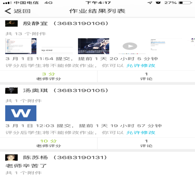 课后:对学习成果及时检测。她通过随机分组的方式将班级里的学生分成小组,大家按组提交练习作业,并进行互评。在此过程中,学生们有机会看到其他同学的作业完成情况,即使家里没电脑的学生,也可以参与到互评中,为同学之间交流提供了平台。