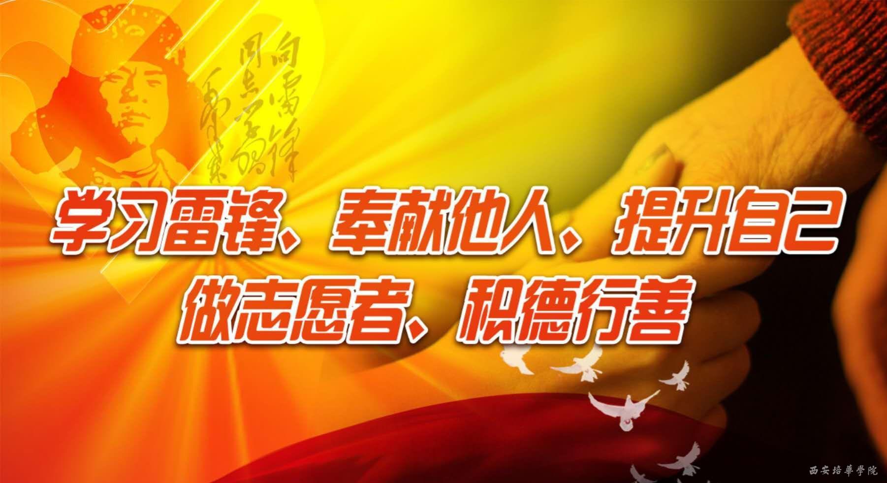 做雷锋的种子,把雷锋精神广播在祖国大地上。我院团委利用课余时间,通过多样的活动方式,更好的弘扬雷锋精神,如:雷锋精神学习推文、自律检查、打扫卫生、体验校内劳动人民生活、给环卫工人送水等等。用自己的实际行动呼吁身边的同学去学习雷锋,弘扬民族文化。