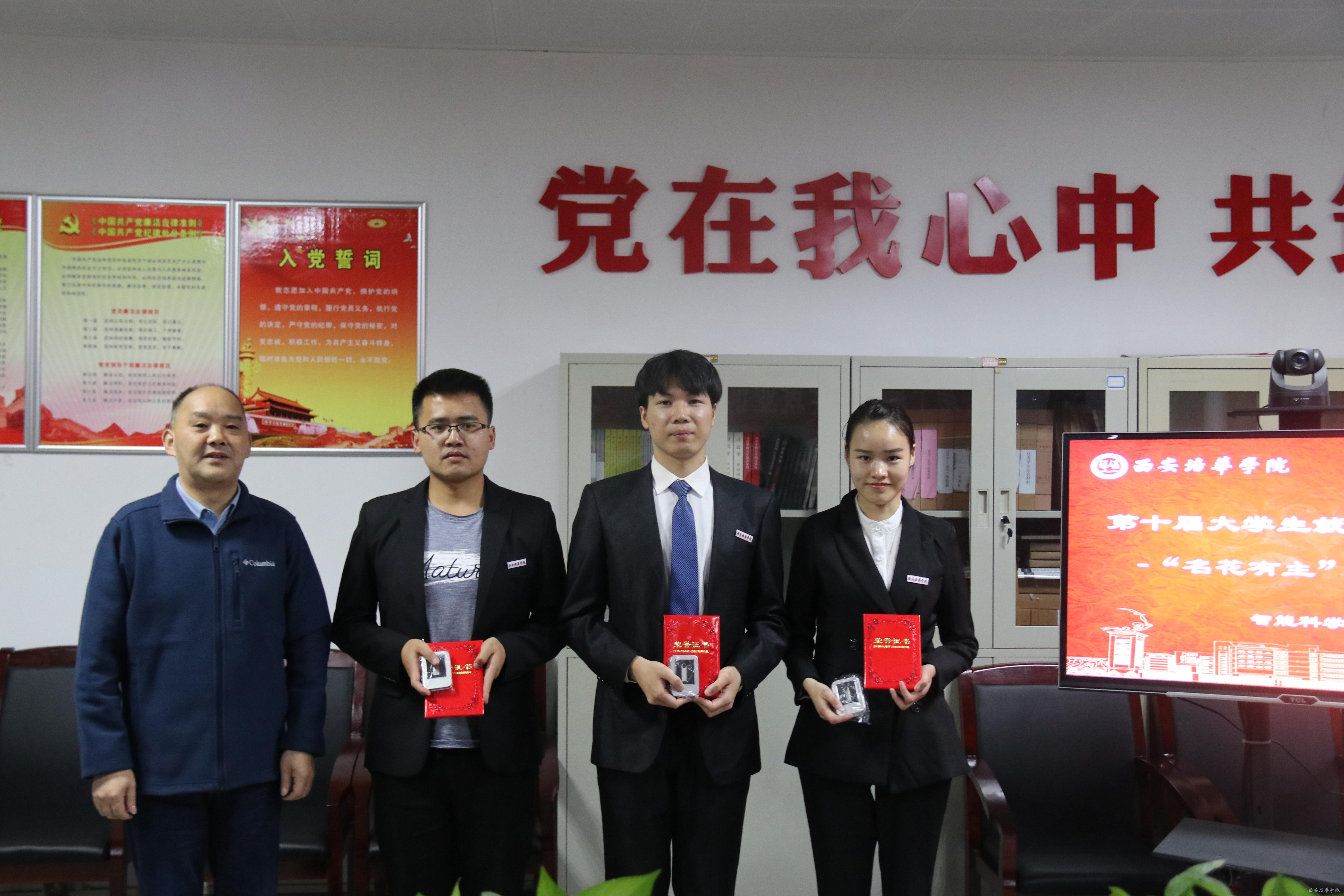 田孝华博士为三等奖选手张宁波、曾成龙、董娟娟颁奖