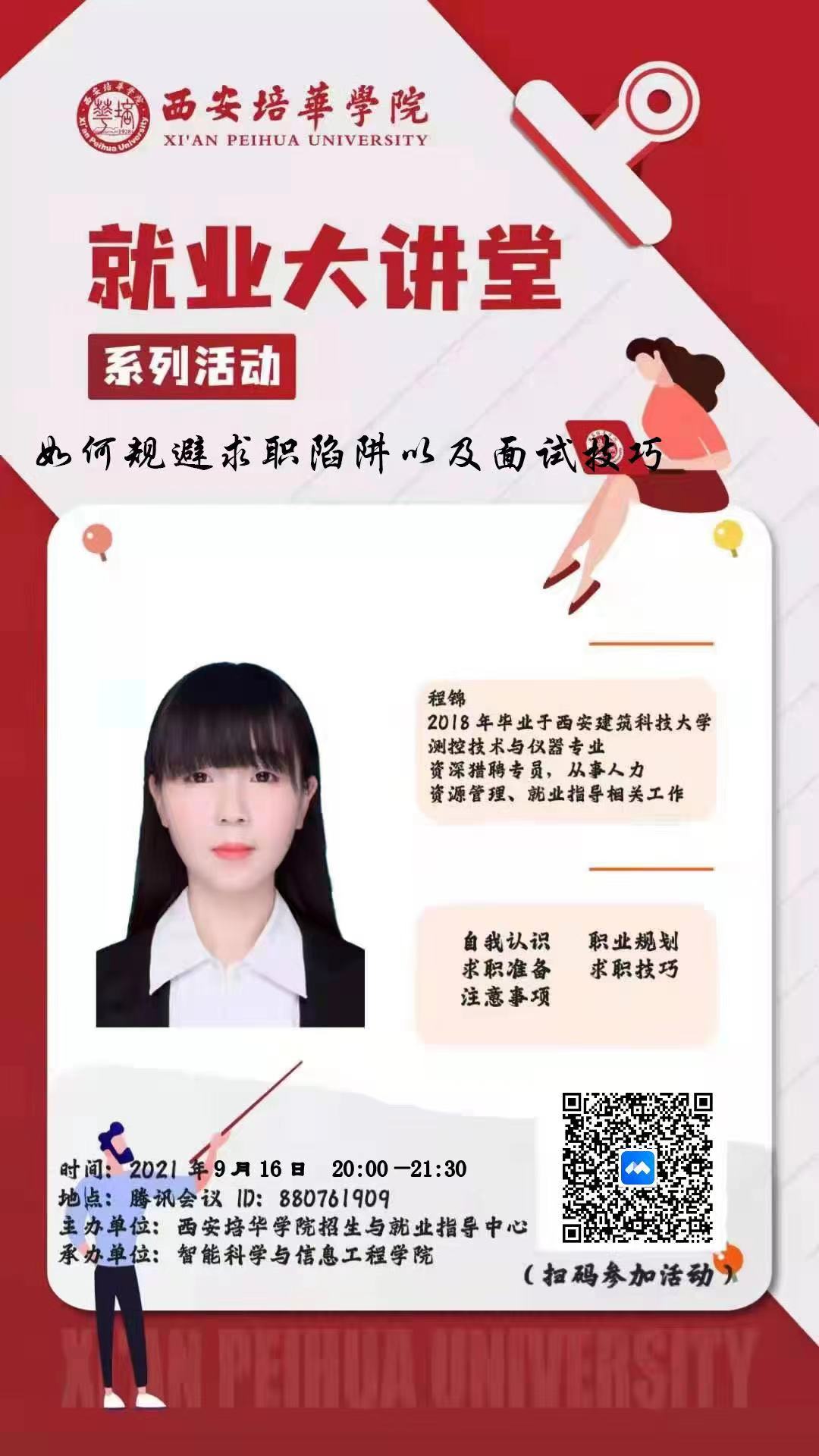 为进一步推动2022届毕业生就业指导工作,提高毕业生的安全意识,规避求职陷阱,我院特邀陕西公众智能科技有限公司程锦老师于2021年9月16日20:00,为我院2022届毕业生做就业指导工作,此次讲座由我院就业专干杨桂锋老师主持。