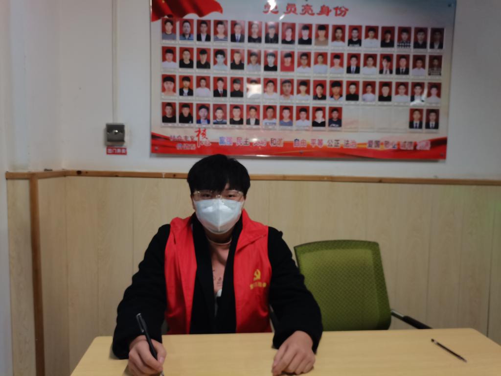 段博文同学毫无怨言、坚决执行学院抗疫志愿服务工作安排,冒着严寒坚守在自己的岗位,认真负责引导着核酸检测队伍;在公寓做志愿者期间,逐个通知各宿舍同学们按照时间节点做好核算检测前的队伍整顿和引导,保持队伍符合防疫秩序。同时,在公寓值守,为大家的进出公寓做好保障。