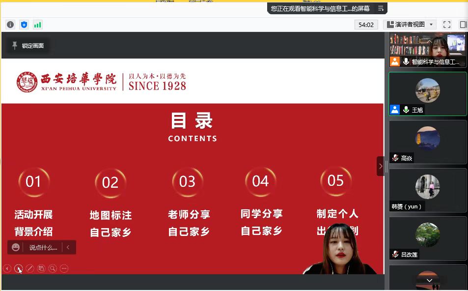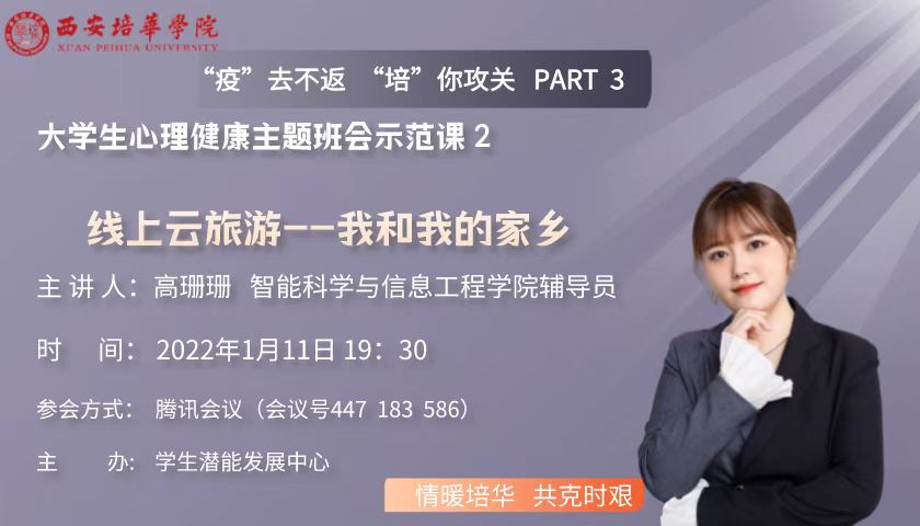 2022年1月11日晚,智能科学与信息工程学院辅导员高珊珊老师开展了一场线上主题班会示范课《线上云旅游——我和我的家乡》,全校辅导员参与会议。一场大学生心理主题班会的示范课,为所有思乡的同学提供诉说乡愁的平台,为参与活动的同学提供祖国各地的大好河山,一朵献给所有在校师生的“小红花”。愿历此坎坷,山河可无恙,人间皆可安。