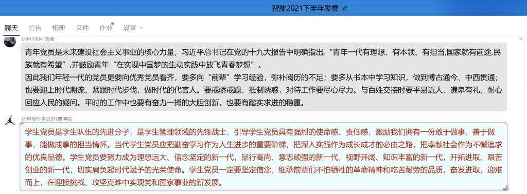 在本期党员发展对象于11月10日在QQ群聊中围绕“为什么入党”、“学习党课后的心得体会”、“对红色精神的领悟”以及“如何以实际行动靠拢党组织”这四个问题进行交流与讨论,每位学员都积极表态,并表示要争取早日成为一名合格的共产党员。