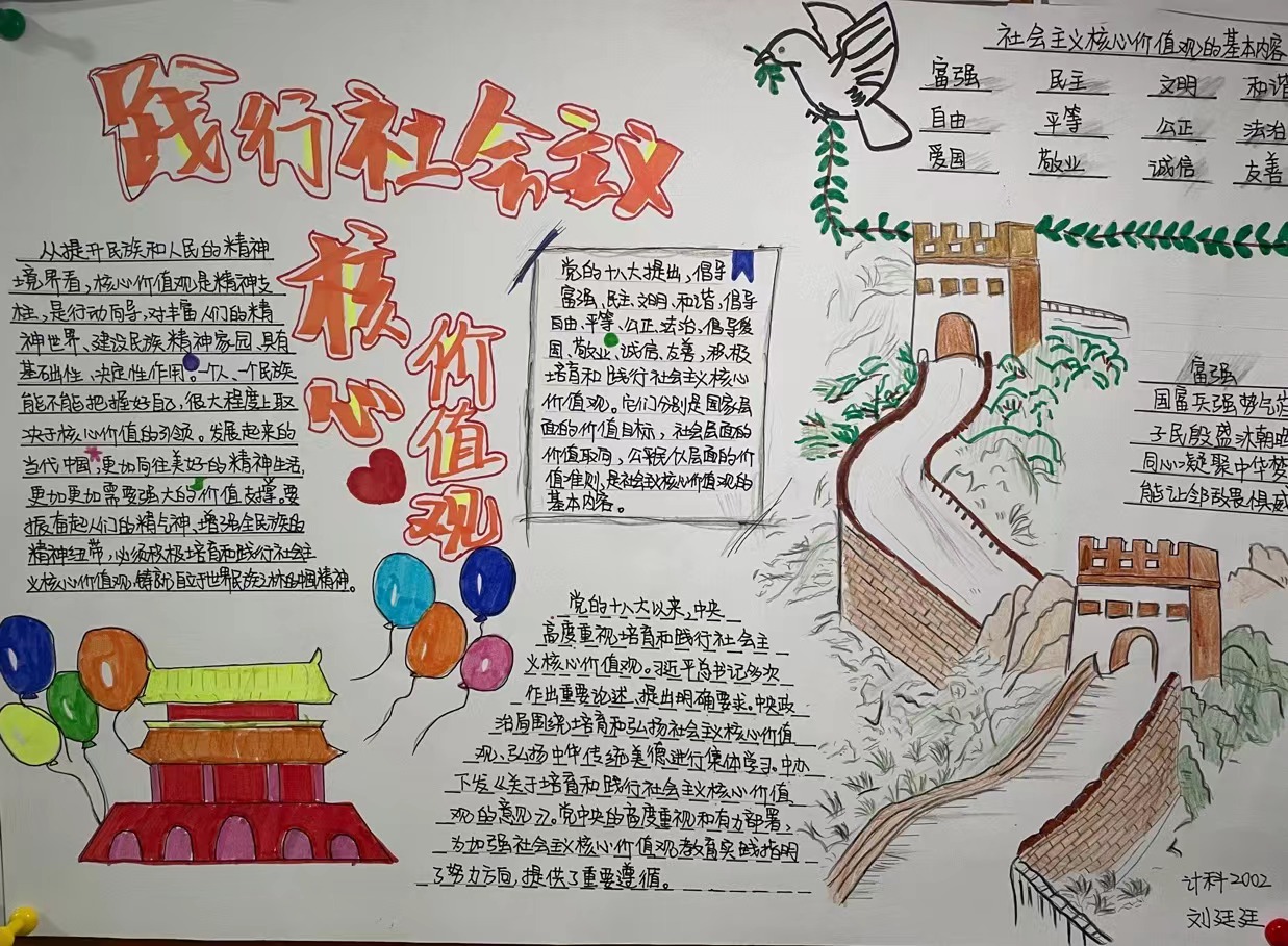 本次活动主要在本次发展对象中进行,围绕“社会主义核心价值观”主题开展手抄报、征文活动。作品内容丰富,紧扣主题,既突出了爱国主义情感,又彰显了学生的个人修养,在全面宣传社会主义核心价值观的基础上,也表达了同学们对待社会主义核心价值观积极的态度。同学们在写、画的过程中,更深刻地理解了社会主义核心价值观的丰富内涵和精神实质。