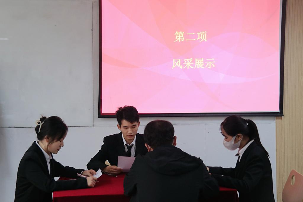 在主持人宣读评分细则之后,比赛正式开始,每一位选手在进来呈递自己的简历后,向各位老师做了3分钟简短却饱含个人经历的自我介绍,从他们的言行举止之中,可以看出他们为了今天的比赛做了很多准备。富有激情的陈词,清晰地表述出自己的职业意向,希望自己的所学可以得到展示,透过他们的简历,展示出来的是一个积极向上的求职者的形象。