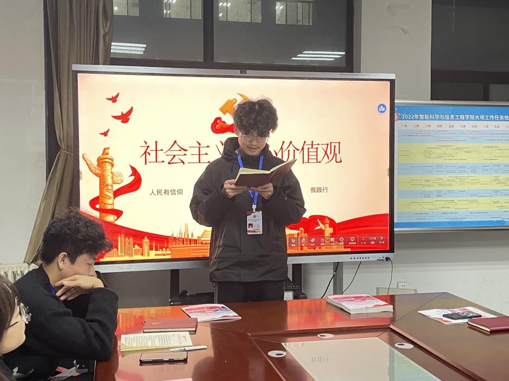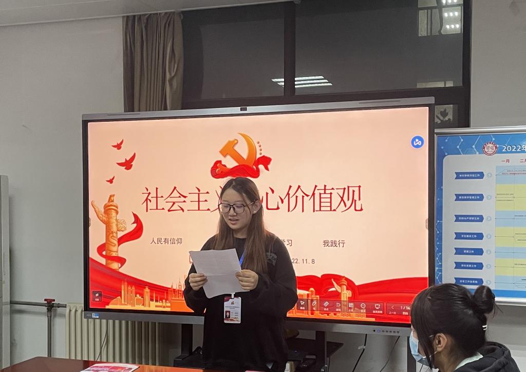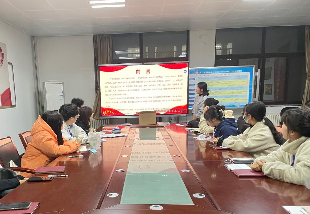 人生需要信仰驱动,社会需要共识,引领发展需要价值导航。为了深入培养和树立正确的价值观,扣好人生的第一粒扣子,我院党总支于2022年11月10日晚在党员活动室开展了“践行社会主义核心价值观”学习交流活动,由第48期入党积极分子穆卓雨同学主持。