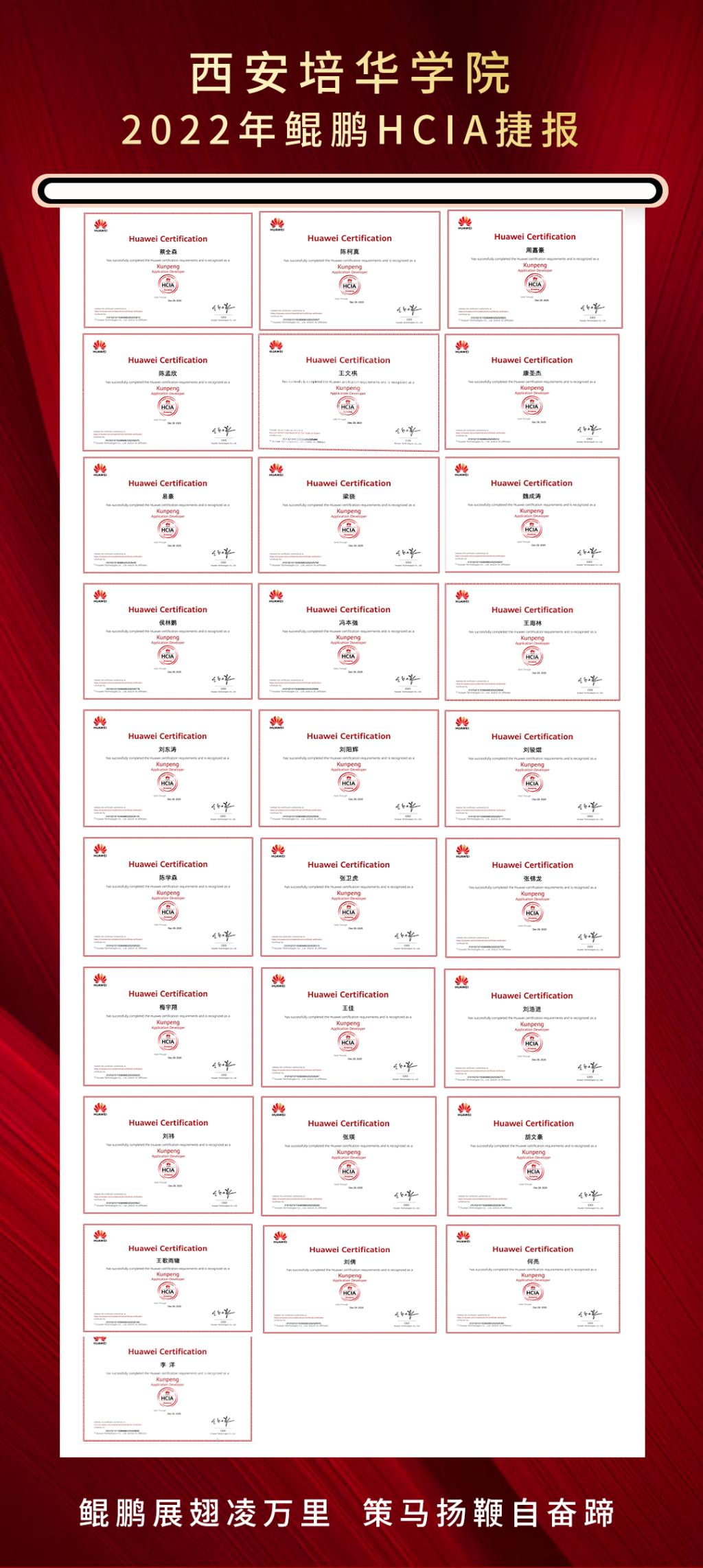 2022年12月,是极具挑战的一个月,在首批安排的鲲鹏专班学生中,虽经历了疫情快速扩散、提前放假、病毒感染等各种问题,但截止2022年12月31日,共有28名学生一次性通过鲲鹏HCIA认证考试,剩余学生大受鼓舞,纷纷表示希望在2023年第二批鲲鹏专班开设和认证考试时,能有机会加入并获得考证的机会。相信在校企双方共同努力下,同学们一定能学有所成,收获满满!