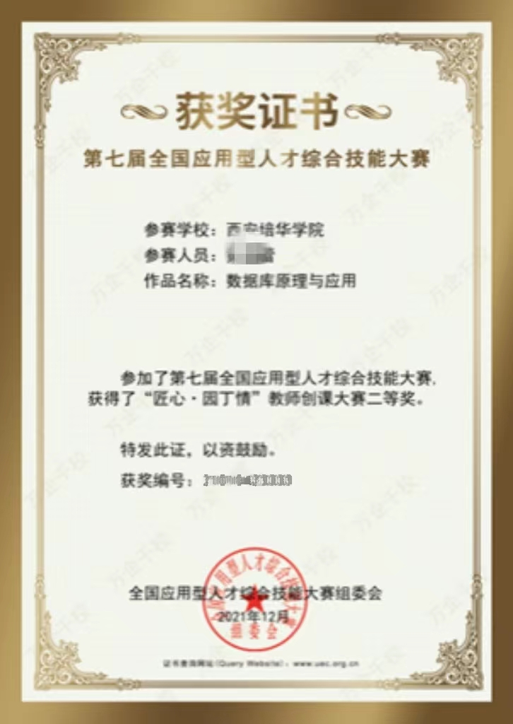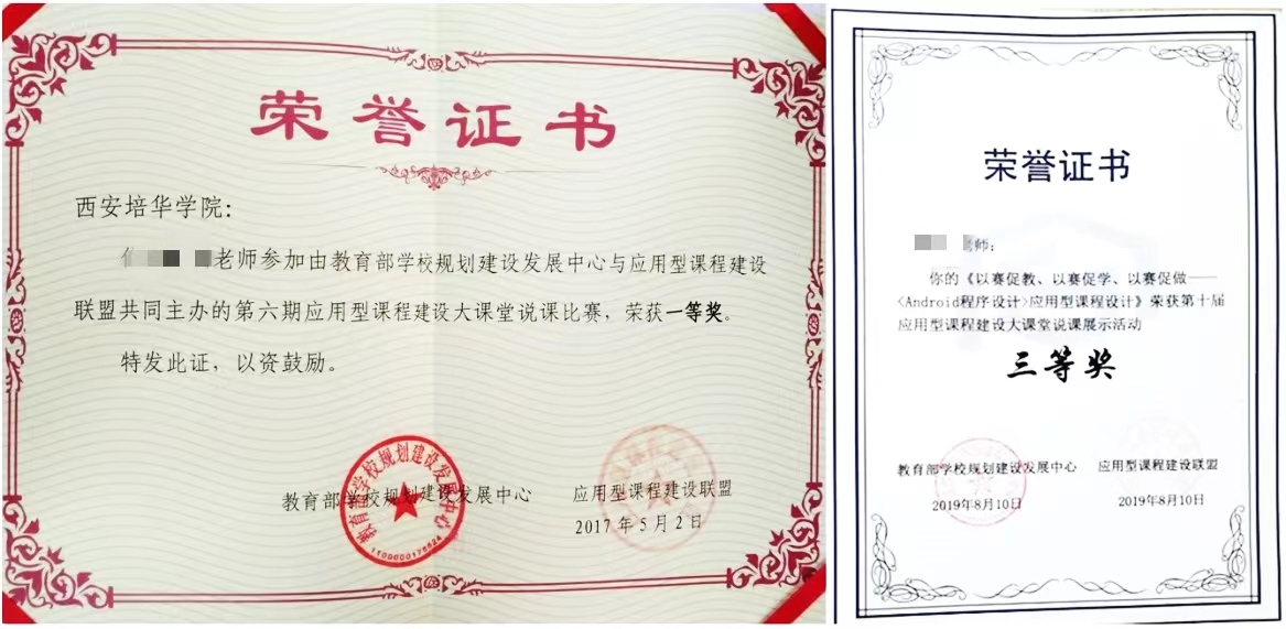 近年来,本专业获批省“1+X证书制度”(大数据平台运维、Web前端开发、计算机视觉应用开发)试点项目3项,省级精品课程1门,省级线下一流本科课程2门,校级应用型示范课程9门,校级精品课程3门。本专业教师先后获得了全国应用型课程建设大课堂说课比赛一等奖及三等奖、全国应用型人才综合技能大赛二等奖及三等奖、西浦全国大学教学创新大赛三等奖、陕西省教师计算机职业技能大赛一等奖、陕西省本科院校课堂教学创新大赛三等奖、学校应用型特色课程评比大赛特等奖,并受聘为教育部应用型课程建设大讲堂讲师团成员,多次在全国进行应用型课程建设经验推广及交流的专题报告。