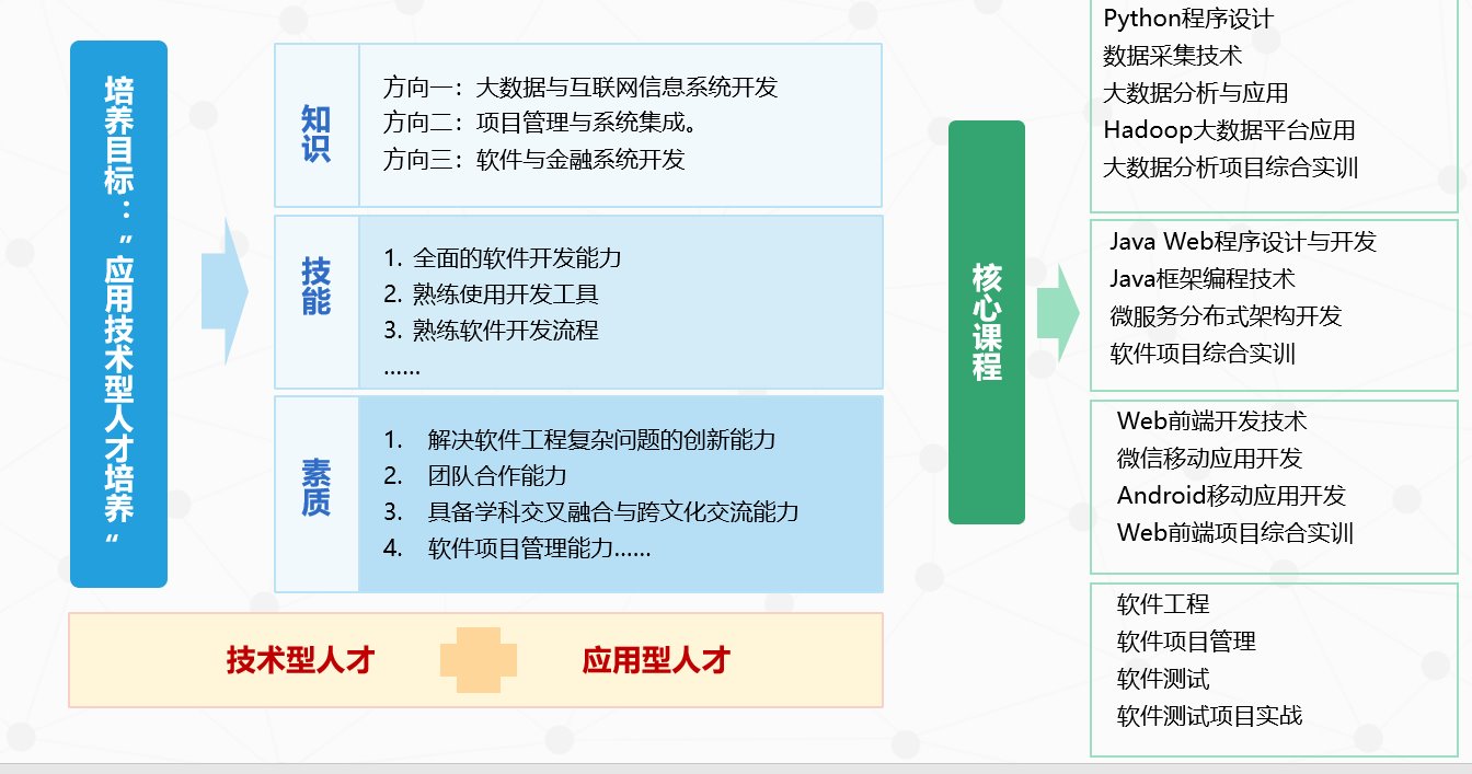 Web前端开发技术、大数据分析与应用、Hadoop大数据平台应用、Java Web程序设计与开发、Java框架编程技术、微服务分布式架构开发、微信移动应用开发、Android移动应用开发、软件工程、软件项目管理、软件测试等。