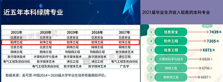 根据《2022年中国大学生就业报告》(就业蓝皮书)显示,软件工程专业就业起步阶段薪资优势明显,就业满意度也相对较高。2021届毕业生平均收入为7205元,在所有本科专业中排行第二。