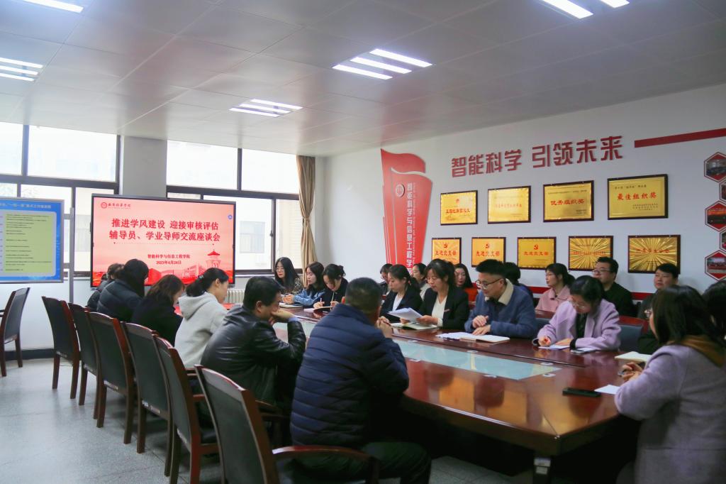 为深入学习贯彻党的二十大精神,落实立德树人根本任务,加强我院优良学风的建设,以迎接本科教育教学审核评估为契机,进一步加强辅导员与学业导师队伍建设,智能科学与信息工程学院于2023年4月24日,在党员会议室召开“推进学风建设 迎接审核评估”辅导员、学业导师交流座谈会,出席本次座谈会的有素质发展教研室主任韦蕊、学院党总支副书记王伟平、辅导员和学业导师。本次座谈会由电子系李颖希老师主持。