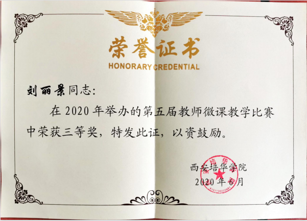 刘丽景老师还获得校级讲课比赛奖项1项;指导学生参加全国大学生数学建模竞赛获得全国二等奖1项,省级一等奖1项;指导学生参加计算机设计大赛多次获得国家级奖项;指导学生参加“数字工匠”大数据分析竞赛获得全国一等奖;指导学生参加其他国家、省部级竞赛多次获得国家级和省级大奖;曾荣获优秀学业导师荣誉称号。