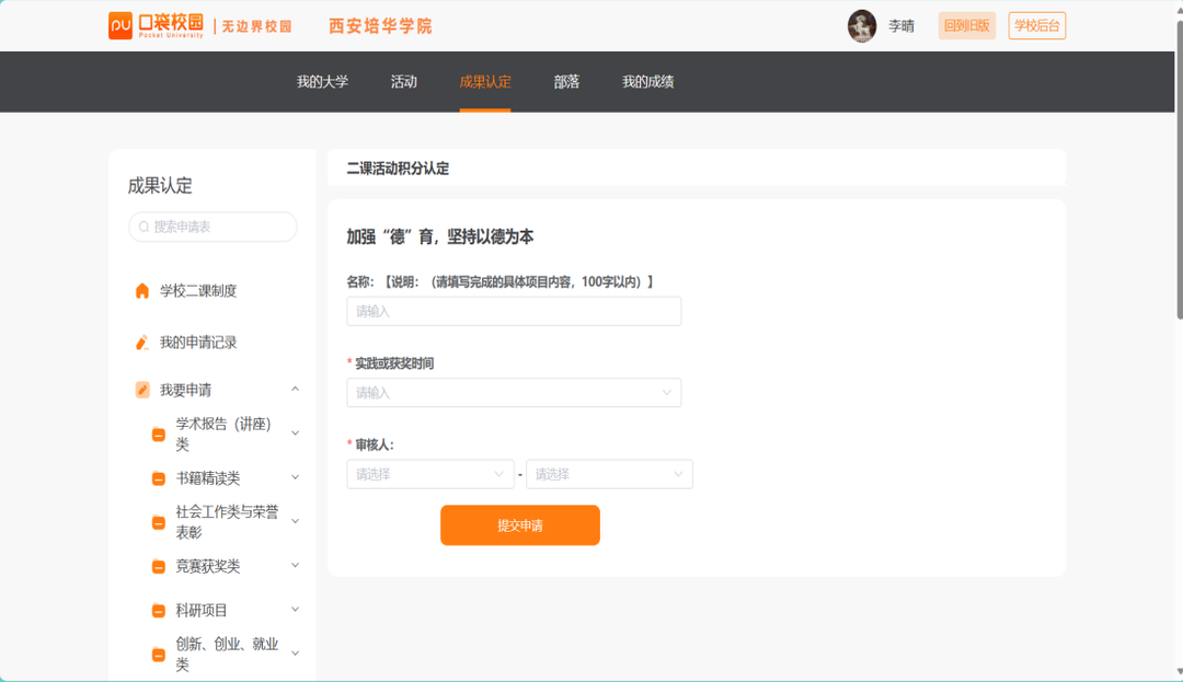 选择并填写相关信息,点击“提交申请”