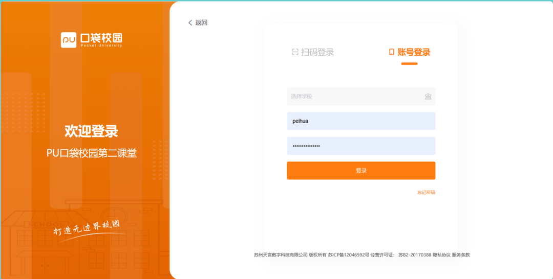选择“西安培华学院”,输入“账号(学号)”和“密码”。