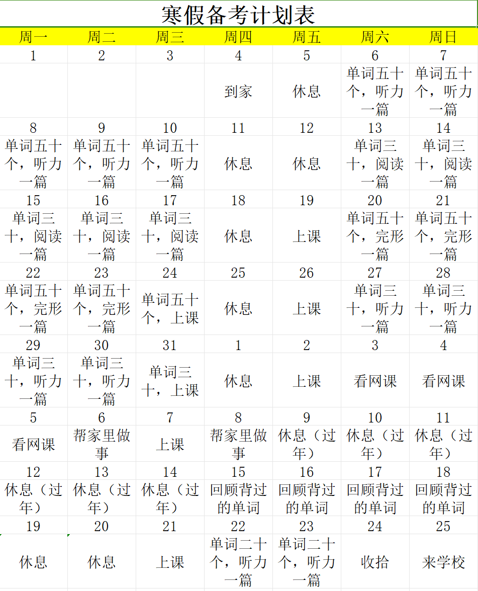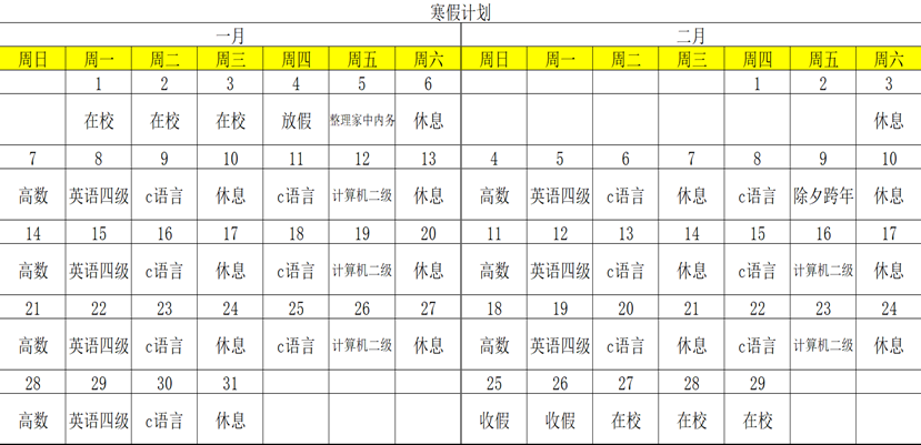在这长达近两个月的时间里,为了下个学期更好的学习,我制定了以下计划。我将按照我所制订的计划完成相应的任务,积累自己的学识,让自己在下学期的学习中相对轻松一丢丢,尽量早日过计算机二级和英语四级。在家学习做饭,培养一项新技能。