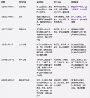 这份学习计划涵盖了所需要学习的主要课程,如大学英语,java,高等数学,大学物理,软件工程等,以及一些与软件工程相关的其他知识,如数据结构,算法,数据库,网络,操作系统,编译原理等。