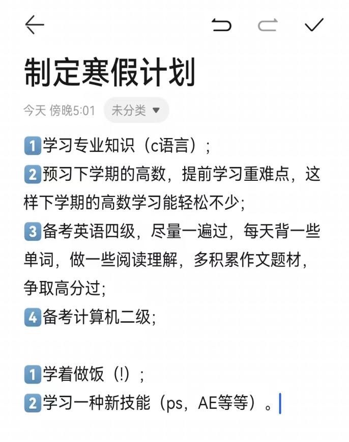 提前了解下学期课程内容,提前学习部分能自己搞懂的知识,开学后遇到新的知识不至于感到手足无措。了解学习计算机二级的内容,自己在网课中学习,准备知识以考试。准备四级考试,坚持背单词,阅读一本书。