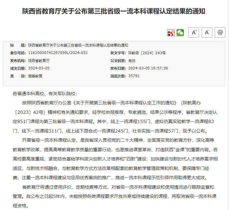 近日,陕西省教育厅发布《陕西省教育厅关于公布第三批省级一流本科课程认定结果的通知》(陕教函[2024]243号),我校共获批6门省级一流课程,其中我院获批2门省级一流课程,林青教授主持的《数据库原理与应用》入选线上线下一流课程,刘清颖副教授主持的《土木工程概论》入选线上线下一流课程。