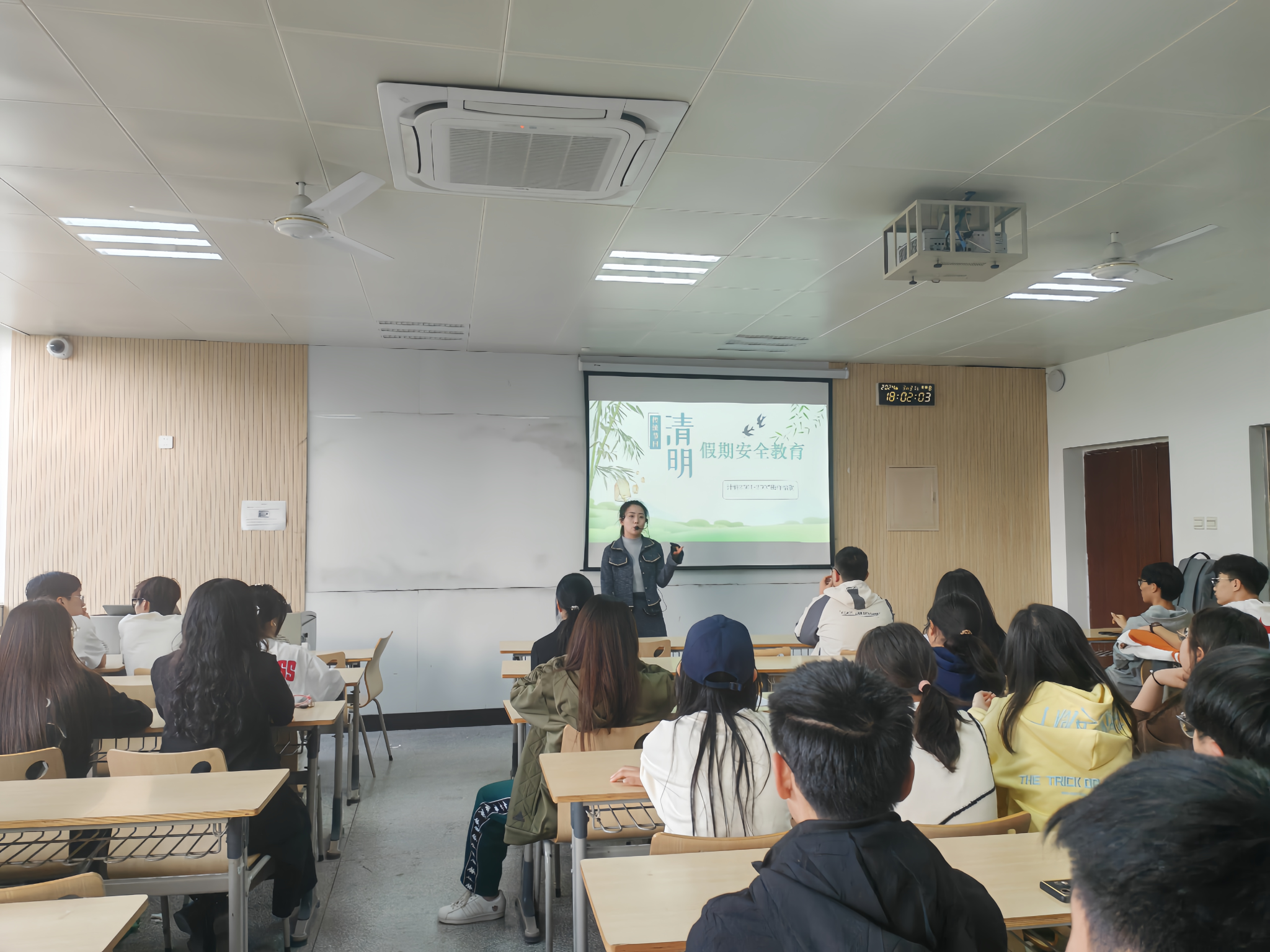 放假前,辅导员以主题班会等形式,对所有学生进行全面的安全教育。包括人身财产安全、网络安全、健康安全、交通安全、消防安全、食品安全等方面的知识。尤其是清明节外出时,通过正规渠道购买车票,不乘坐无证无牌及超载车辆,提高自身安全防范意识。