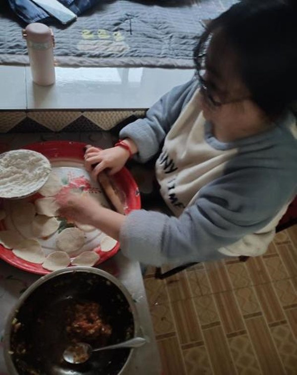 图为计科2101班张晗在家为母亲梳头 图为计科2101班张雪菲在家包饺子