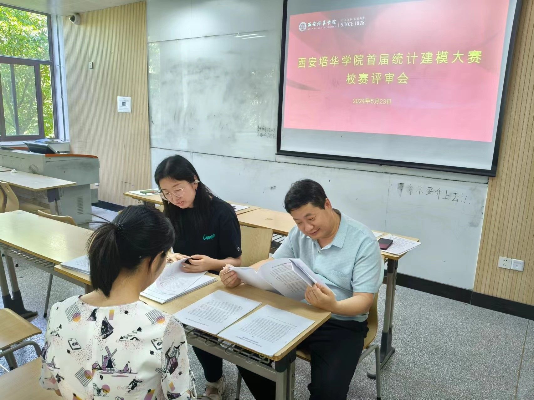 5月23日中午,指导教师分两组对提交的31篇论文针对国赛评分标准,进行了认真的评阅,经过反复的讨论,最终选拔出19篇优秀作品,代表我校参加陕西赛区省赛工作。
