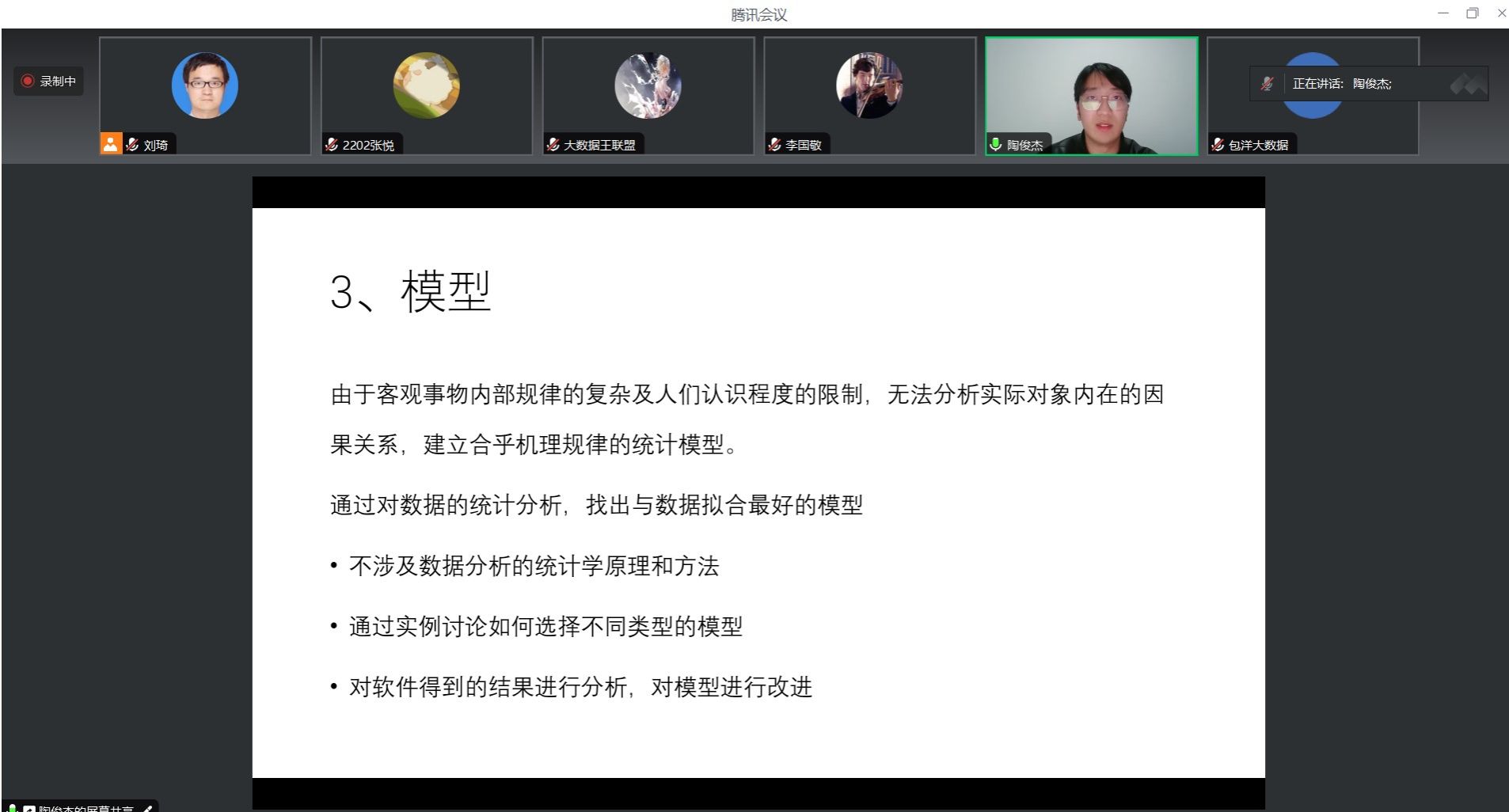 为了更好的对大赛的主题进行理解,以便参赛学生能够更好的进行选题及写作,指导组除了组织参赛师生观看全国组委会有关大赛主题解读系列讲座外,还专门邀请了安徽财经大学统计学专业学生陶俊杰(现已被报送至华东师范大学硕士,2023年统计建模国家奖项获得者)线上以亲身经历为同学们分享了统计建模竞赛经验。