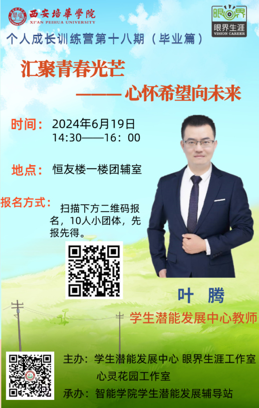 本次活动由智能科学与工程学院潜能发展辅导站和智心无涯工作室承办,2024年6月19日下午16:00在恒友楼二楼知爱室举行,本期训练营由学生潜能发展中心叶腾老师带领,来自智能科学与工程学院的12名学生倾情参与,一起共同回首大学四年的点滴,展望未来的无限可能。