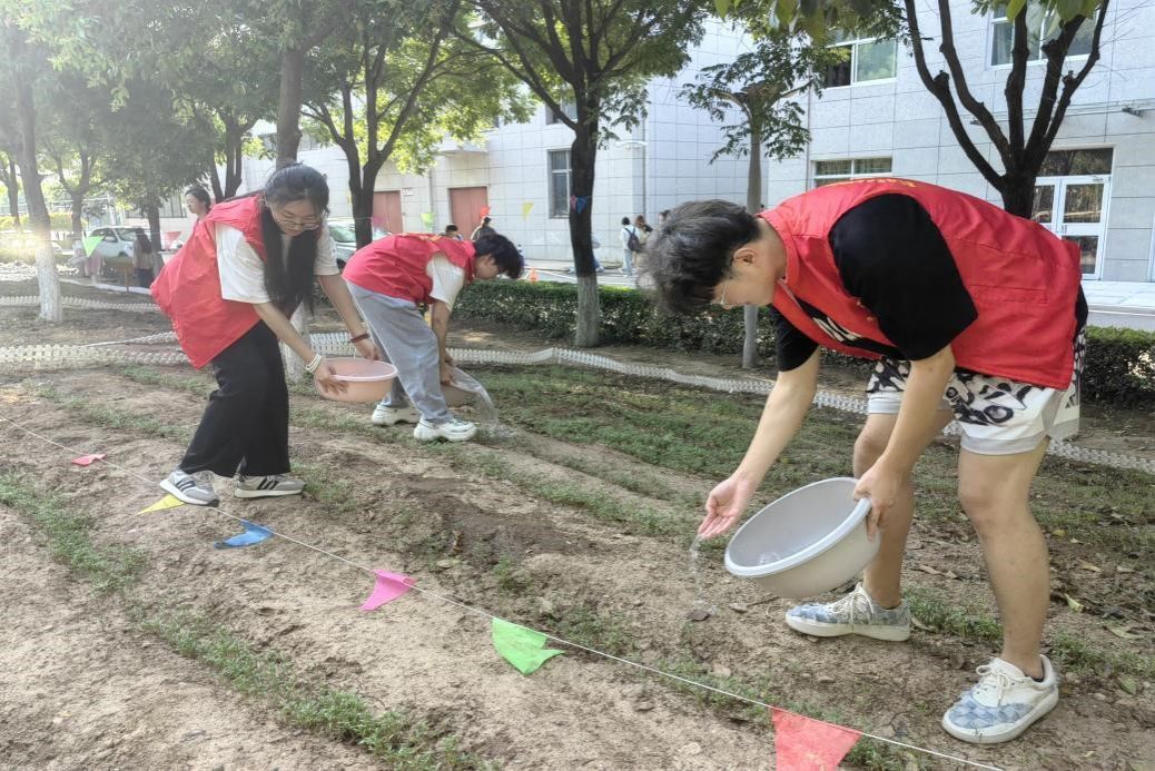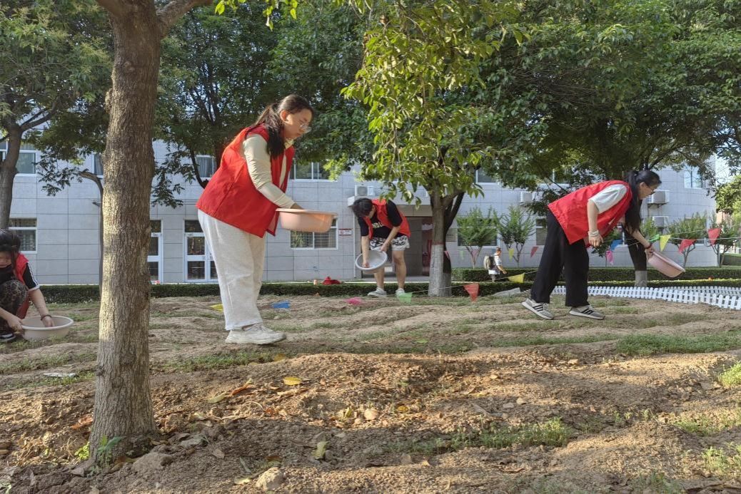 每日下午放学后,热心的党员、积极分子们穿着统一的志愿者服,纷纷手持水盆等工具在我院劳动教育基地现场分组、认领责任片区并用心浇灌播种区域。