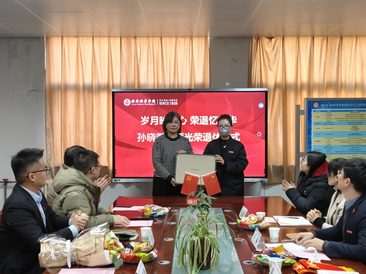 为深入学习贯彻全国教育大会精神,弘扬西安培华学院尊师重教的优良传统,1月15日,智能科学与工程学院在育英楼3204会议室隆重举行“岁月映初心 荣休忆芳华”荣休仪式,向为学院奉献多年的荣休老师孙晓微表达崇高敬意与美好祝福。校监事会主席、纪委书记、工会主席兼党工部、组织部、统战部部长陈玲、校工会办公室负责人党惠敏、院领导班子及教职工代表出席了仪式。仪式由学院党委书记兼行政副院长王林主持。