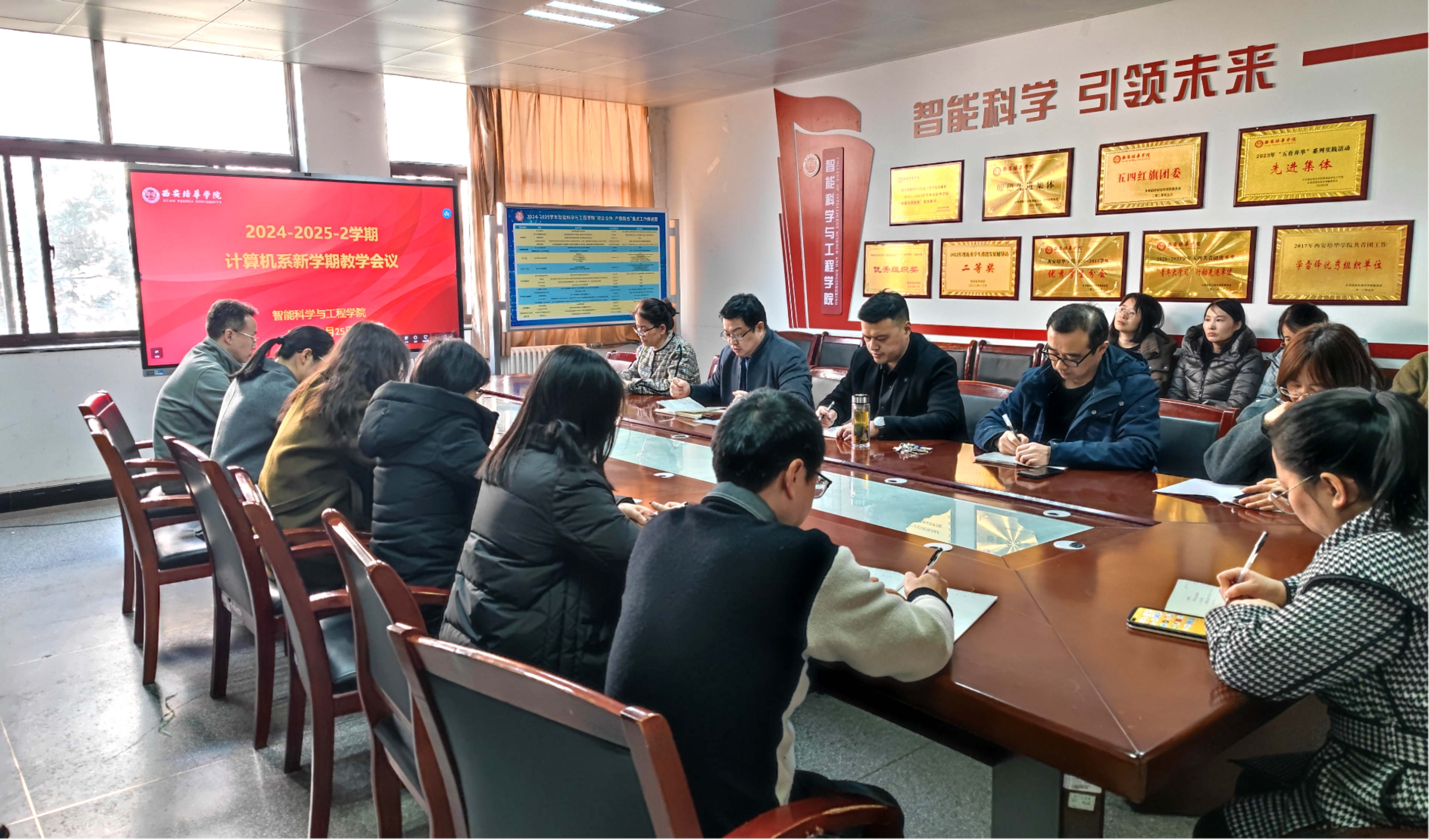 2025年2月25日,计算机系在学院会议室召开新学期教学工作会议,全面规划新学期教学工作,计算机专业全体教师参与,焦纯主任主持会议。