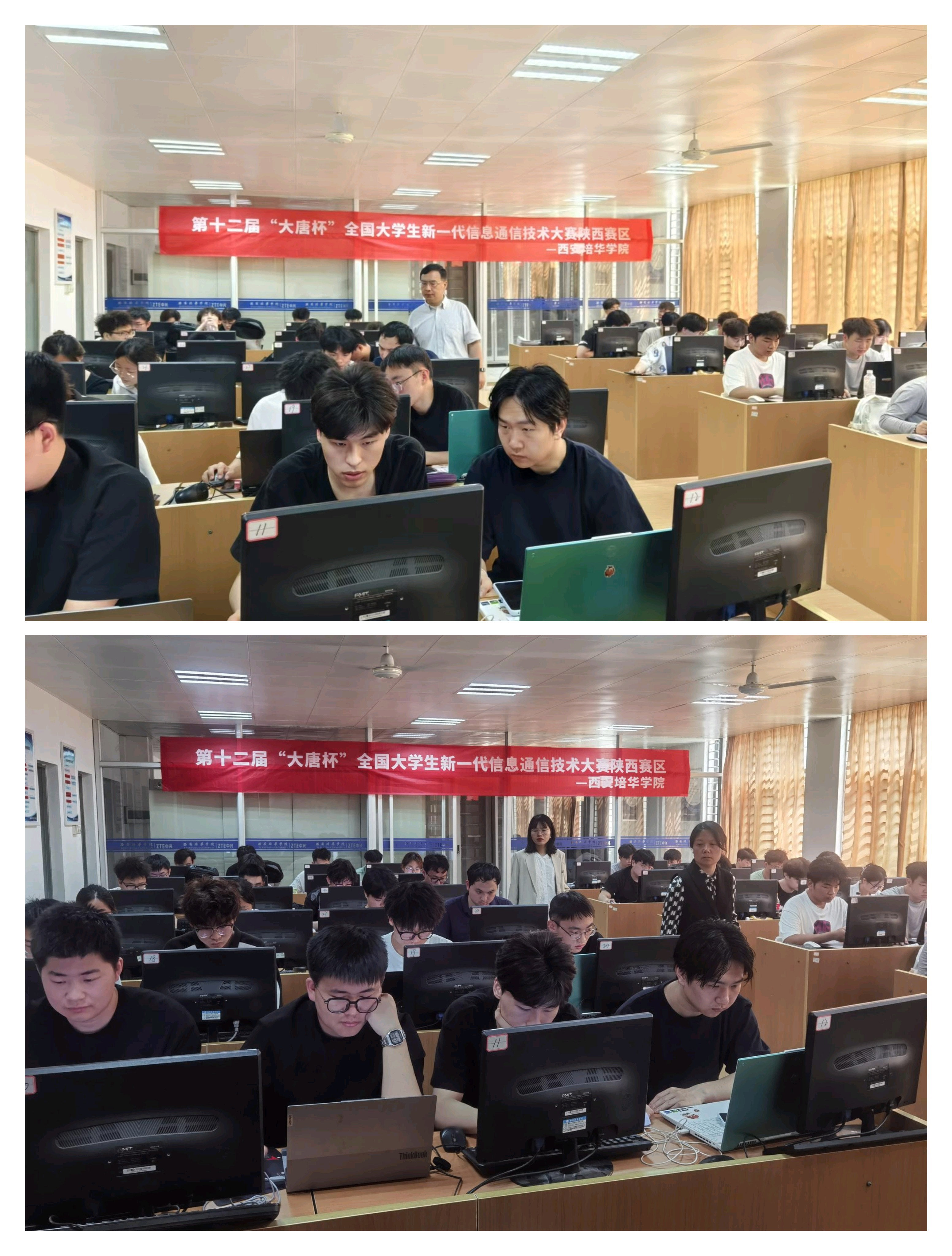 上图为西安培华学院智能科学与工程学院电子系51组同学正在认真参加第十二届“大唐杯”全国大学生新一代信息通信技术大赛(省赛)。监考老师徐进、吴静、文显琼、李颖希、彭斯琦,技术支持老师卜文强。