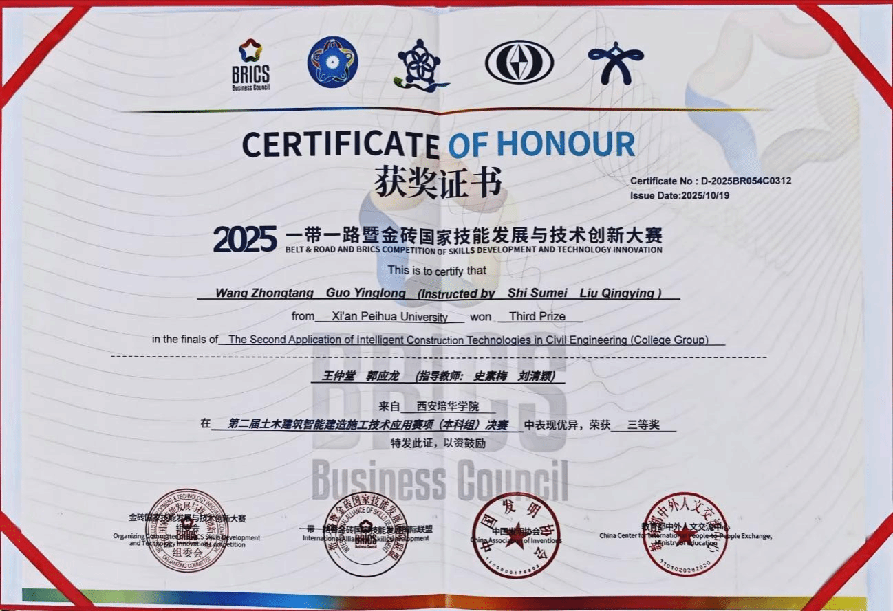 西安培华学院智能科学与工程学院组织的参赛队伍在5月17至18日的区域选拔赛中获土木建筑智能建造施工技术应用赛项一等奖1项、二等奖1项;在10月17至19日的全国决赛中三等奖1项。