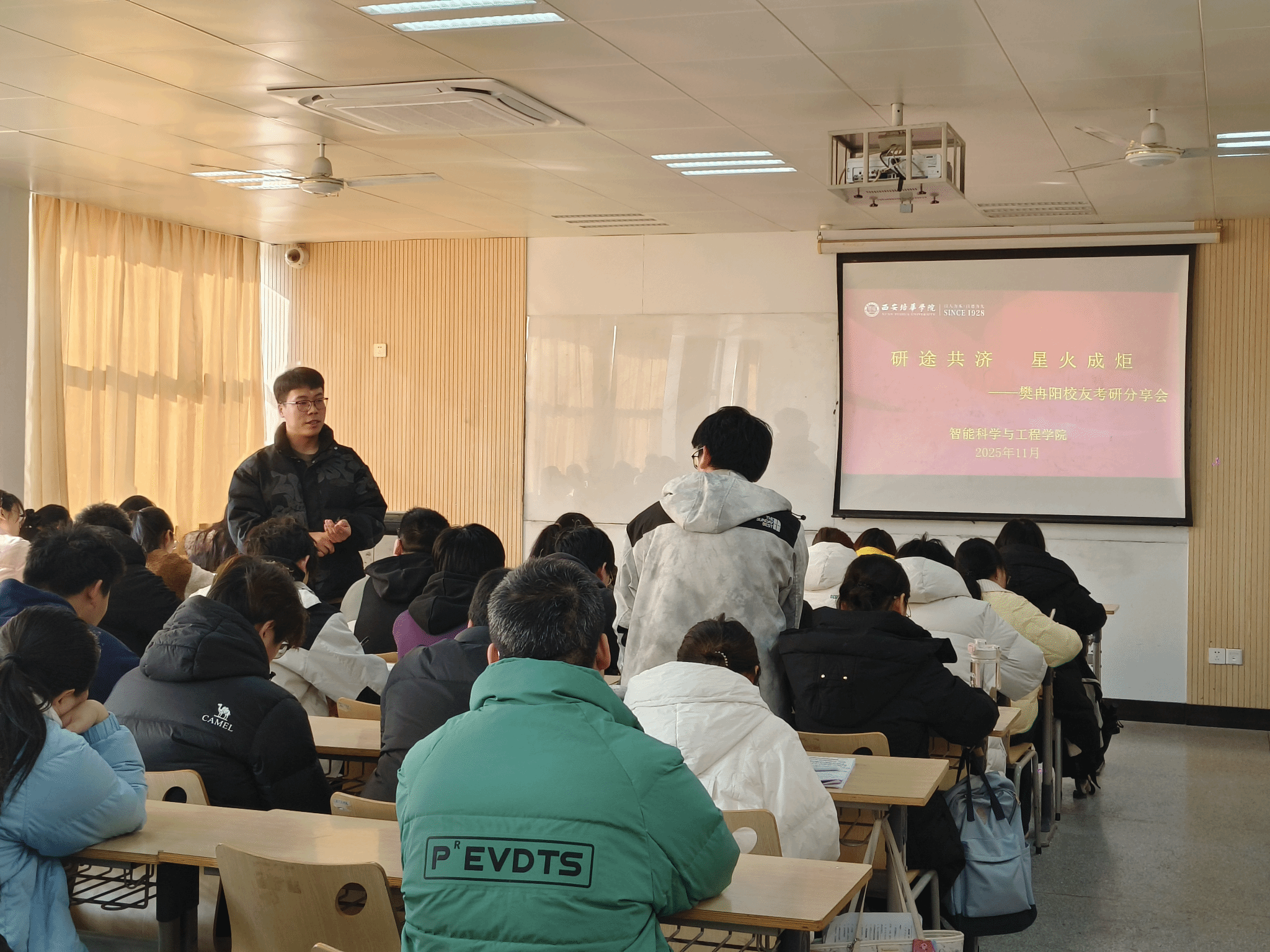 为帮助在校学子明晰考研方向、掌握备考技巧、坚定升学信念,近日,智能科学与工程学院精心筹备并成功举办 2025 年考研经验交流分享会。本次分享会特别邀请到 2022 届计算机科学与技术专业校友、现西安建筑科技大学研究生张贾辉,以及 2023 届通信工程专业校友、现陕西师范大学研究生樊冉阳返校,为备战考研的同学们传经送宝,分享宝贵经验。